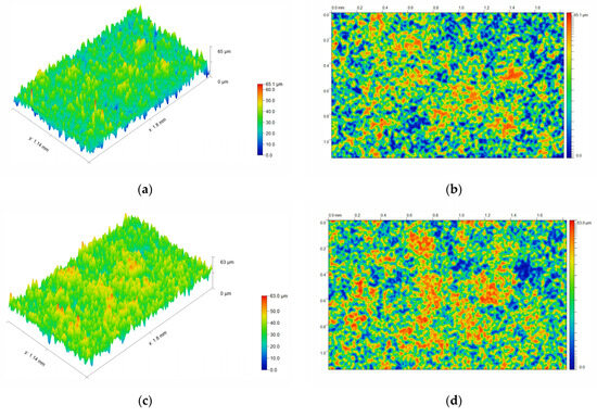 Surface roughness: (a) Planar views of the untreated core; (b) Three-dimensional views of the untreated core; (c) Planar views of the FHB-Treated core; (d) Three-dimensional views of the FHB-Treated core.
