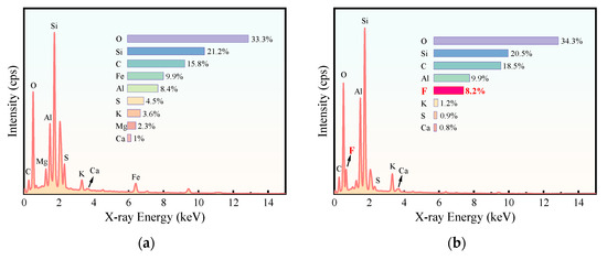 EDS analysis was performed at corresponding locations on the SEM images to analyze the distribution of FHB on the core surface. For the control group (Figure 7a), i.e., the core surface without FHB treatment, the surface was primarily composed of O, Ca, Si, and C elements. This composition is attributed to the quartz being the main component of the sandstone sample, with pores filled by cementing materials such as calcite. The detected Al and K elements correspond to clay and feldspar minerals. The presence of S and trace Fe elements may originate from residual petroleum sulfonates and the introduction of iron debris from cutting and grinding tools during sample preparation. After FHB modification (Figure 7b), not only did the carbon content on the rock surface increase, but a distinct distribution of F element was also detected, confirming the successful attachment of the fluorinated interfacial modifier to the core. This indicates that the fluorocarbon interfacial modifier formed a stable fluorine-containing coating on the core surface, significantly altering its chemical composition.