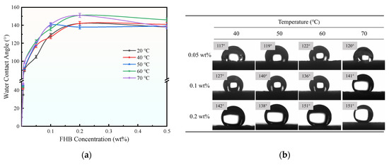 To most directly measure the changes in core surface wettability, the contact angles were measured using oilfield formation water and crude oil. Core surfaces were first treated with FHB solutions at a series of concentration gradients (0.005%, 0.01%, 0.05%, 0.1%, 0.2%, and 0.5%, all by mass fraction) at corresponding temperatures to investigate the effect of FHB on core wettability. The resulting water and oil contact angles are shown in Figure 8 and Figure 9, respectively. The untreated core exhibited contact angles of 0° for both water and oil. As shown in Figure 8, the water contact angle increased rapidly with rising FHB concentration. The untreated surface was water-wet, but even at a low treatment concentration (0.01 wt%), the surface became hydrophobic (contact angle > 90°). The contact angle continued to rise sharply with further increases in concentration. When the FHB concentration increased from 0.1 wt% to 0.2 wt%, although the contact angle exceeded 150°, reaching the superhydrophobic range, the rate of increase slowed significantly and showed no further improvement with higher concentration. Comparing different solution preparation and treatment temperatures, the contact angle slightly increased as the temperature rose from room temperature to 70 °C. This can be attributed to the improved alignment and exposure of the hydrophobic fluorocarbon chains on the rock surface at higher temperatures, where better functional group coverage is essential for achieving superior hydrophobic and oleophobic properties [28].