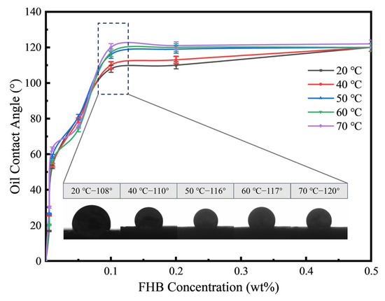 Oil contact angle results and representative images under different FHB concentrations and treatment temperatures.