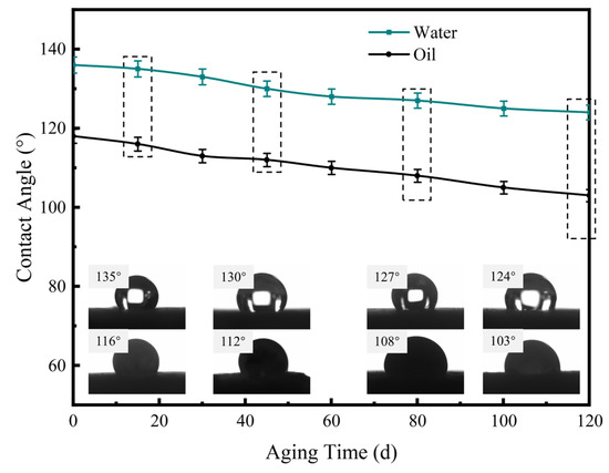 To evaluate the anti-aging performance of the FHB solution and the treated cores, samples treated with 0.1 wt% FHB were aged in formation water at 55 °C for 120 days. Water and oil contact angles were measured periodically to monitor wettability stability. As shown in Figure 11, the hydrophobic property of the treated core decreased only slightly during the 120-day aging period, from 135° to 124°. The oleophobic property declined to 108° by day 80 (from an initial 118°), after which the decrease slowed, and the surface remained non-oil-wet with an oil contact angle of 103° after 120 days. The sustained hydrophobic and oleophobic properties are primarily attributed to the covalent grafting of fluorocarbon chains onto the core surface, as confirmed by FT-IR and XPS analyses. Compared to traditional surfactants and nanoparticles, which rely on electrostatic adsorption, intermolecular forces, or physical adsorption [30,31], this chemical anchoring offers superior resistance to long-term flushing by heated formation water, demonstrating promising potential for oilfield applications.