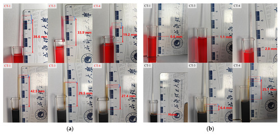 The relationship between wettability and capillary pressure in core pores is often preliminarily evaluated using spontaneous imbibition tests in glass capillary tubes. CT-1, CT-3, and CT-4 represent capillaries with inner diameters of 0.1 mm, 0.3 mm, and 0.4 mm, respectively. The spontaneous imbibition results of these capillaries in water (dyed red) are shown in Figure 12a. CT-1 demonstrated the strongest water uptake, reaching a height of 38.6 mm, while CT-3 and CT-4 showed sequentially lower heights of 34.9 mm and 19.2 mm, respectively. The oil uptake heights were 42.5 mm, 29.5 mm, and 27.4 mm for CT-1, CT-3, and CT-4, respectively. According to the Young-Laplace equation, the imbibition height is inversely proportional to the capillary radius, which explains the decreasing heights from CT-1 to CT-4.