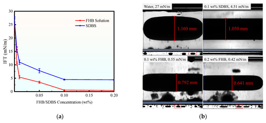 To verify that FHB solution can not only alter the surface properties of rocks but also enhance oil recovery through other mechanisms—such as reducing oil-water IFT, softening residual oil, and improving mobility ratio, thereby promoting the mobilization of residual oil—this study further measured the changes in IFT using the spinning drop method (CNGTX700, Shengwei Tech., Beijing, China). The test liquid and oil droplets were loaded into the sample cell. Under rotation, the droplet formed an elongated shape due to the combined effects of gravity, centrifugal force, and IFT. The oil-water IFT value was calculated using data including the oil-water density difference, rotational angular velocity, and cylindrical droplet radius [18].
