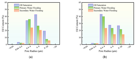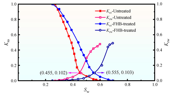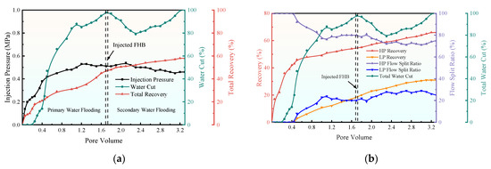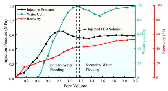 The core flooding comprised five main stages: water saturation, oil saturation, primary water flooding, FHB solution injection, and secondary water flooding. During water saturation, cores were first placed under vacuum conditions followed by water injection via displacement apparatus to ensure full saturation (HKY-1, Hai’an Pet. Res. Instrum., Nantong, China). Injection pressure and effluent flow rate were continuously monitored during water flooding and FHB injection to calculate fluid permeability changes. All core flooding tests were conducted in triplicate (n = 3) for each experimental condition to ensure the reliability and statistical significance of the results. The data presented in the relevant tables are reported as the mean value ± standard deviation. Experimental procedures followed Chinese national standards: “Practices for Core Analysis (GB/T 29172-2012)” [19] and “Test Method for Two-Phase Relative Permeability in Rock (GB/T 28912-2012)” [20].