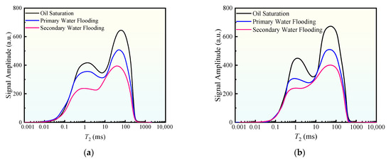 Low-field nuclear magnetic resonance (LF-NMR, MesoMR23-060H-I, Niumag, Suzhou, China) technology precisely characterizes oil-water distribution in rock pores by detecting the relaxation behavior of hydrogen nuclei (1H) in a magnetic field. The core principle relies on distinct relaxation properties of hydrogen nuclei in oil versus water molecules, enabling signal separation via pulse sequences. To exclusively measure oil distribution, formation water containing 2.5 wt% MnCl2 was used to shorten the aqueous phase relaxation time [22]. Fluid relaxation times (T2) in pores involve three mechanisms: surface relaxation (T2s), bulk relaxation (T2b) and diffusion relaxation (T2d) [23]. These are governed by Equation (7):