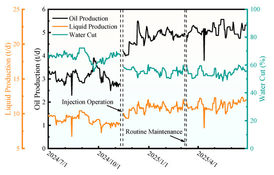 Based on the promising results from laboratory experiments, a field trial was conducted in a production well from the Daqing Oilfield. The operational procedure involved the direct tubing injection of a 2 wt% FHB solution alternated with formation water, utilizing a designed huff-and-puff process (see Table 2 for specific parameters). Following the chemical injection, a substantial volume of formation water was injected to displace the chemical slug deep into the formation and prevent its retention within the tubing. The well was subsequently shut in for 2 days to allow sufficient reaction time between FHB and the reservoir rock. Afterwards, the well was returned to normal water-flooding operations. The subsequent monitoring of oil production rate and water cut confirmed the effective engineering application and performance of the FHB system for enhancing oil recovery.