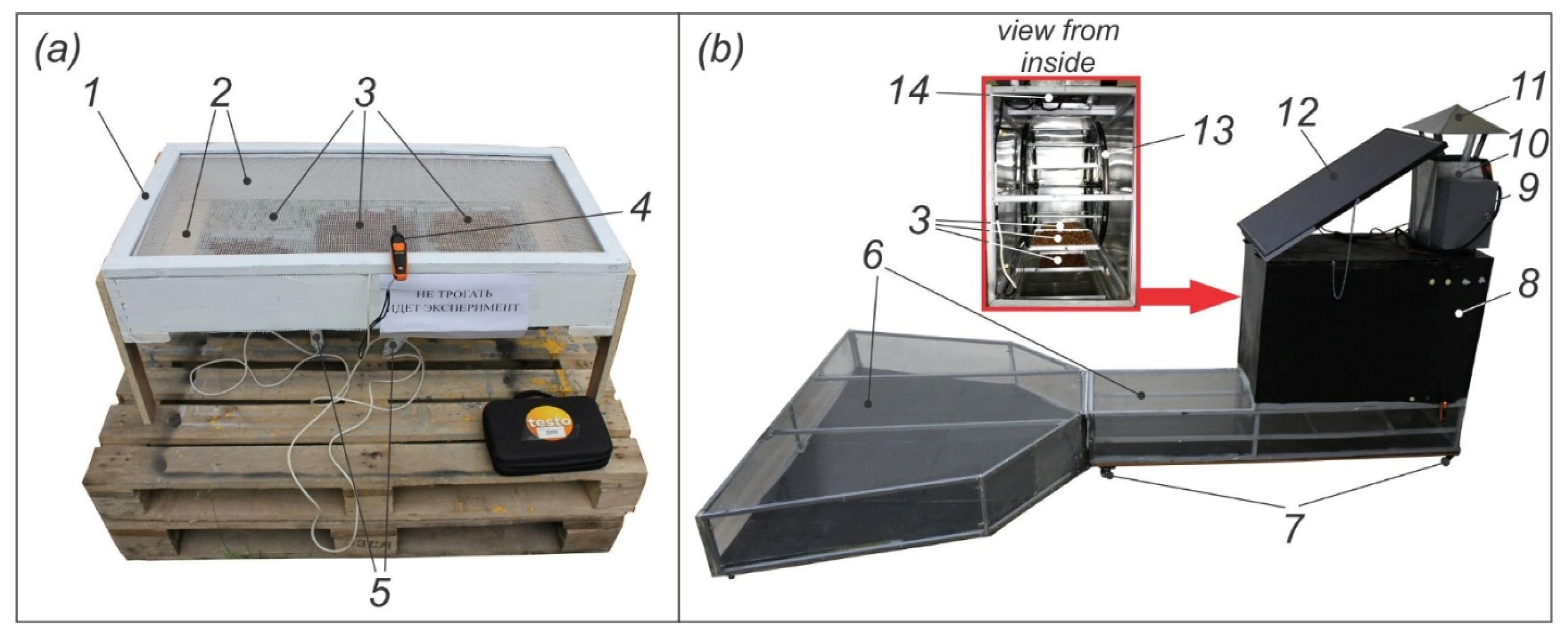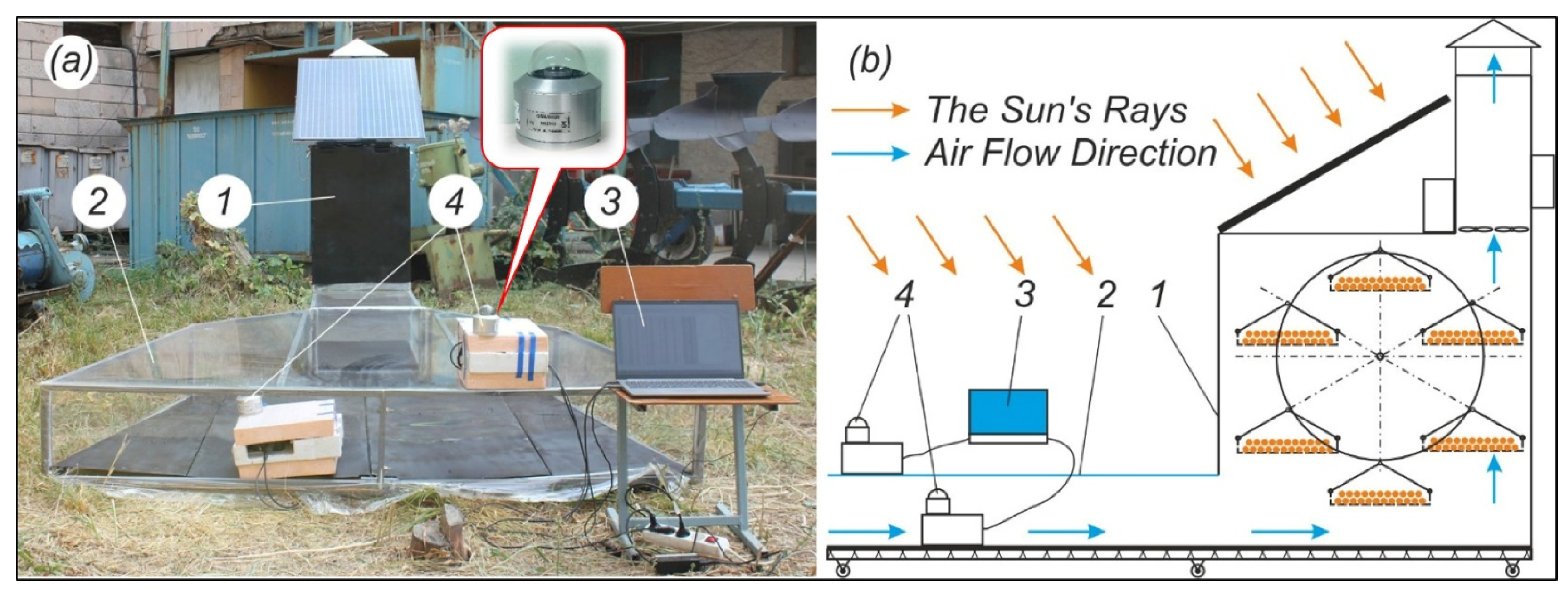 Figure 6. Measurement of solar radiation: (a) general view; (b) schematic diagram. Key: 1—solar dryer chamber; 2—transparent film; 3—recording device (tablet); 4—pyranometers.