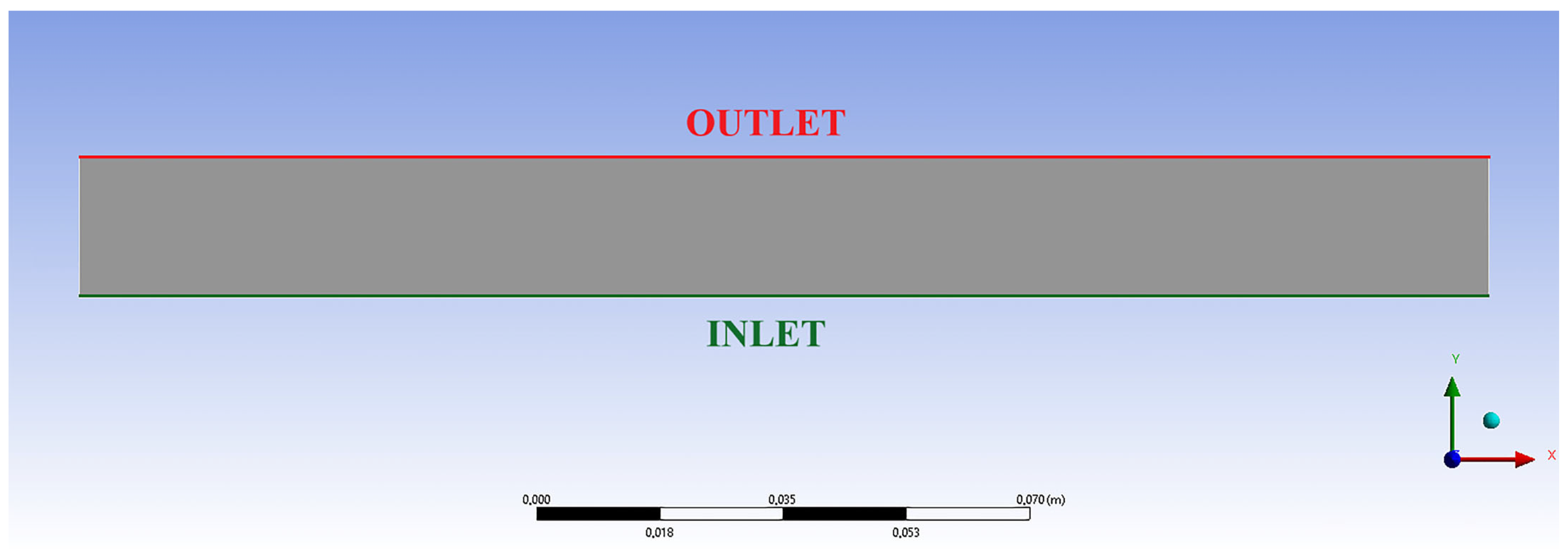 Subsequently, heat transfer and moisture evaporation within a layer of bee bread granules on a shelf were simulated. The computational geometry for this 2D simulation is shown in Figure 4 (length: 20 cm, height: 2 cm). The initial conditions for the two drying scenarios are provided in Table 3.