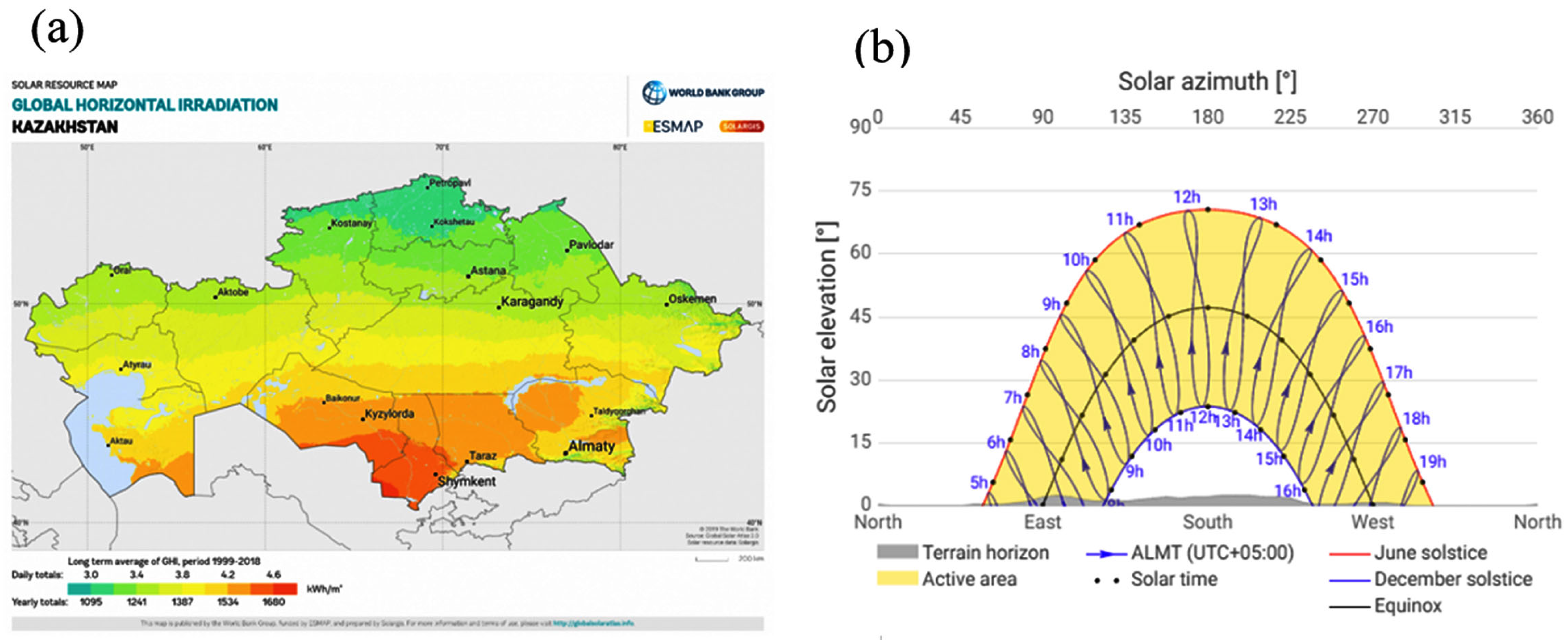 Figure 5. Solar radiation in the research area: (a) Global Horizontal Irradiation; (b) Solar azimuth.