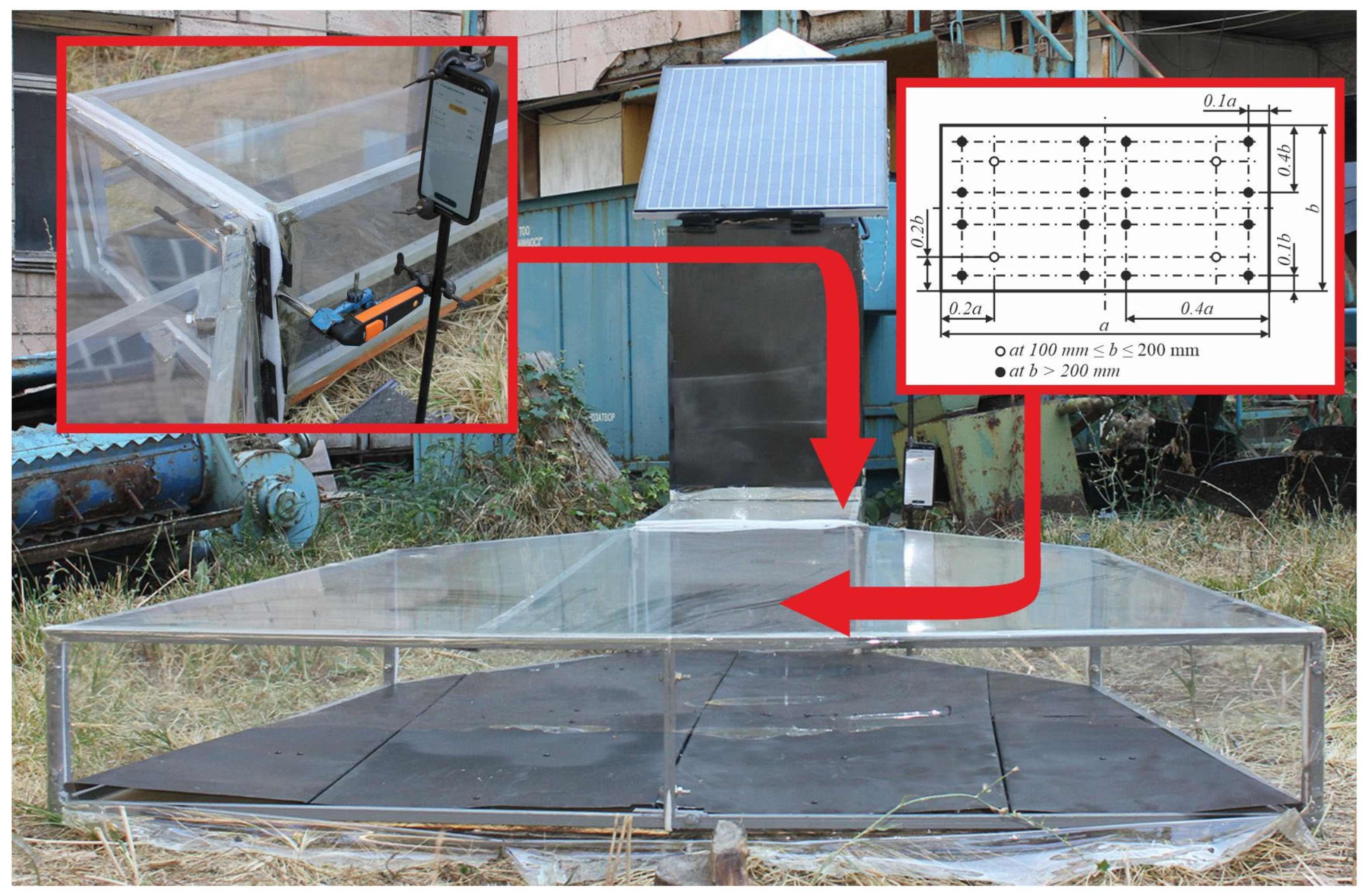 The developed system was a solar dryer operating exclusively on solar energy. Air heating was achieved via a solar collector integrated into the dryer’s base. The surface of this collector was enclosed by a transparent polymer film, which performed two key functions: forming the air heating chamber and shielding the system from environmental contamination. The film sections were hermetically sealed at junctions of complex configuration using a heat welding process [27].
