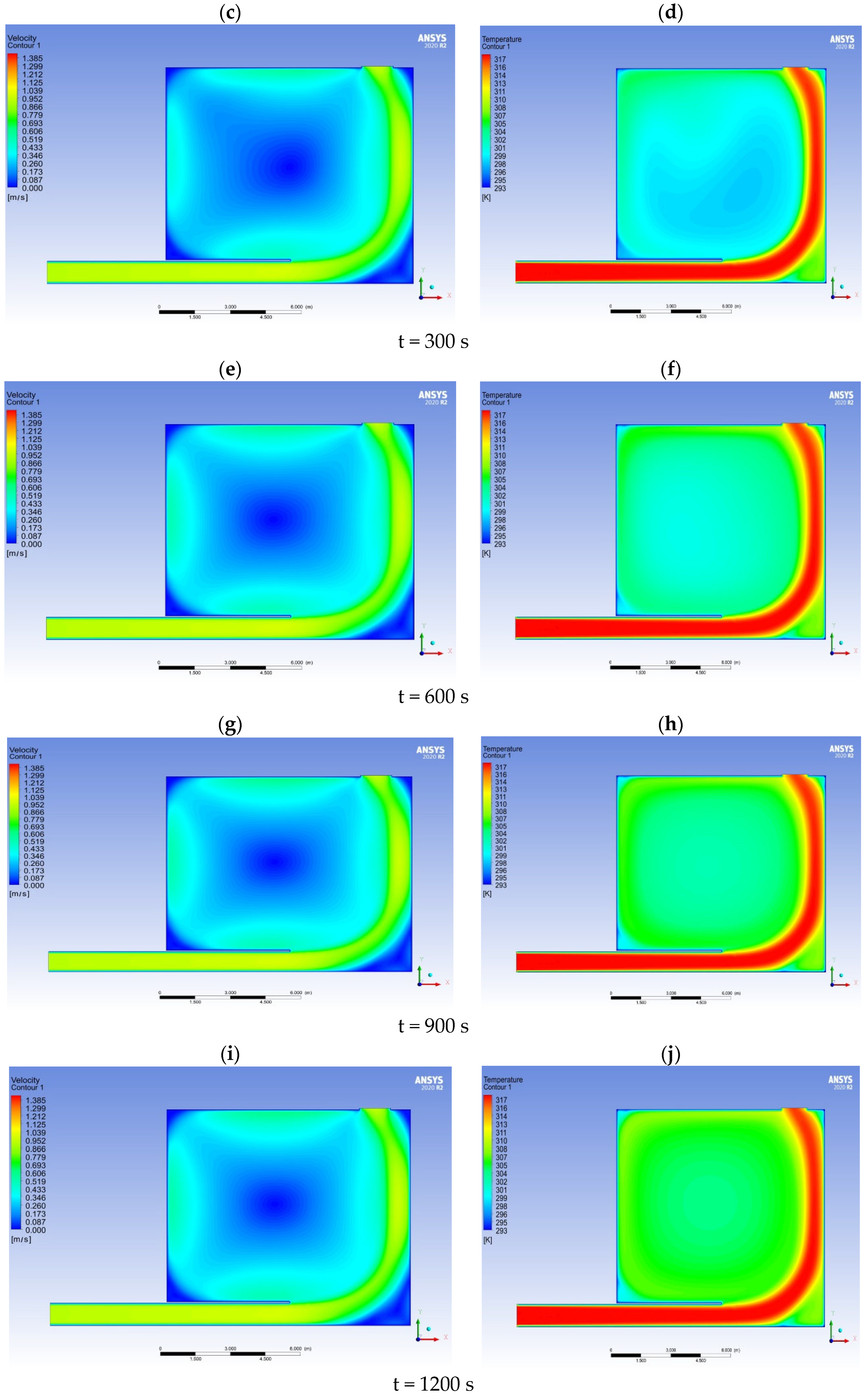 The simulation results are presented as velocity contours in Figure 8a,c,e,g,i, and temperature contours in Figure 8b,d,f,h,j for time intervals of t = 60, 300, 600, 900, and 1200 s, respectively.
