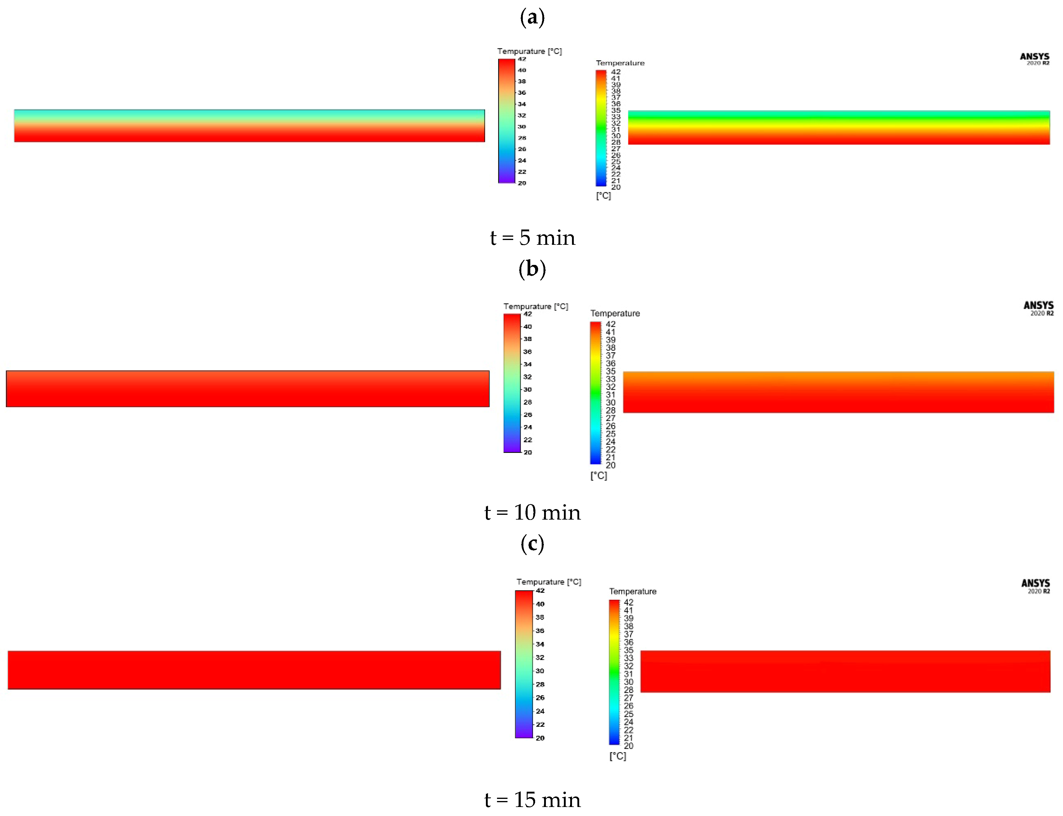 Figure 9. Contours of temperature changes simulated in Python (left) and ANSYS Fluent (right) at various time intervals. (a) at t = 5 min; (b) at t = 10 min; (c) at t = 15 min.