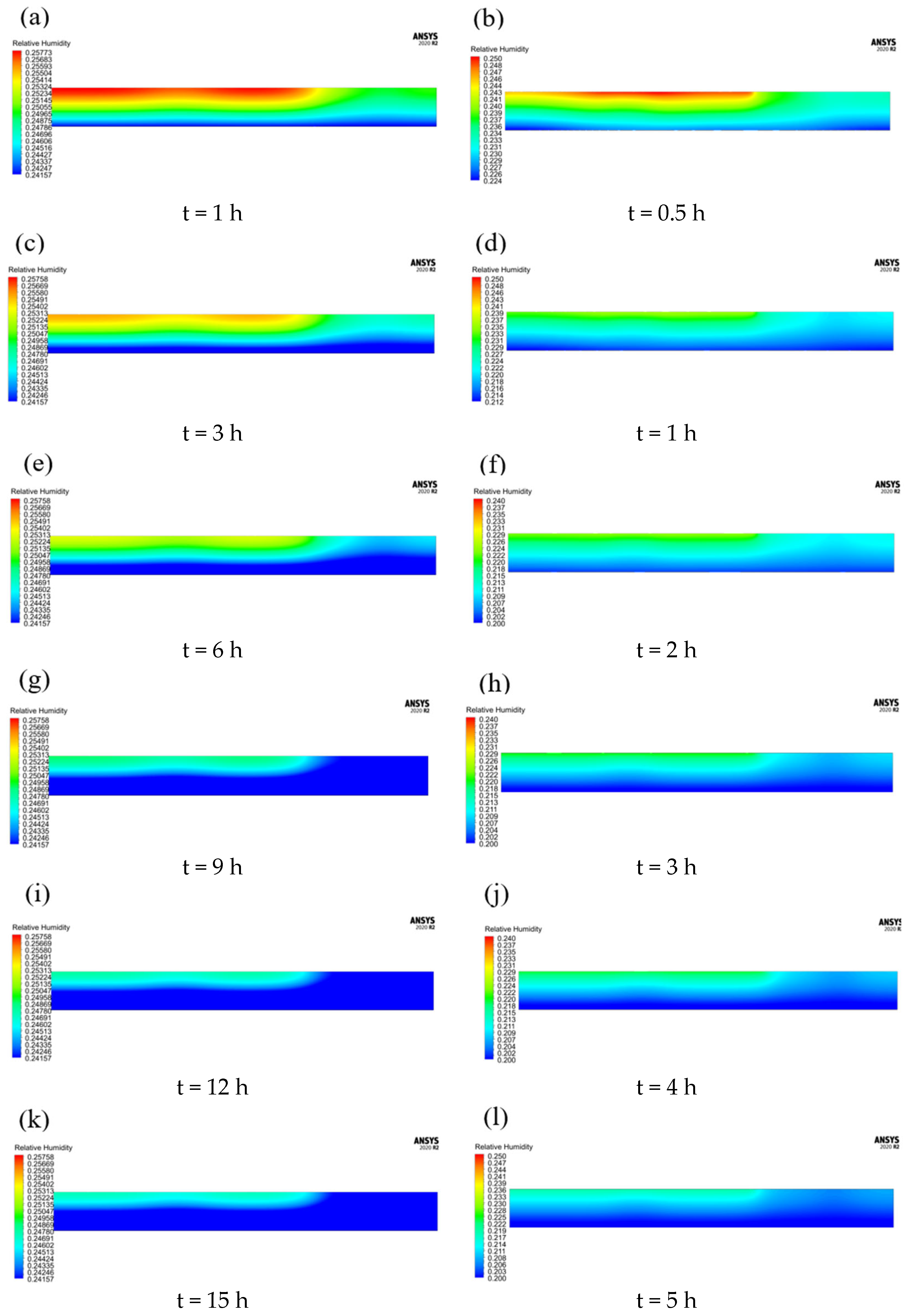 The process of moisture evaporation from layers of bee bread granules of identical thickness was modelled in ANSYS Fluent for both natural open-air drying and drying in a solar dryer chamber. The results are shown in Figure 11 as a series of contours depicting moisture content over time for natural drying conditions (left) and solar drying (right).