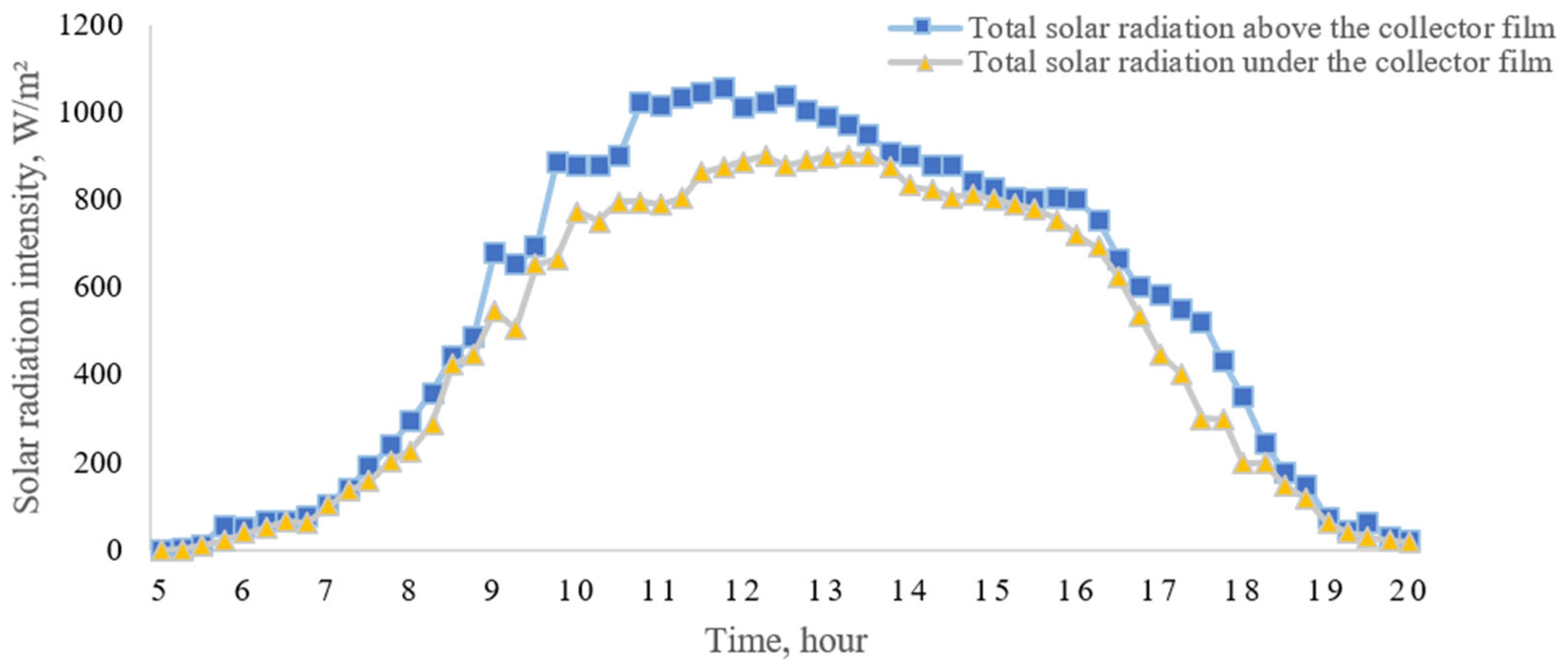 Figure 13. Comparative measurement of solar radiation intensity before and after transmission through the protective film of the solar collector.