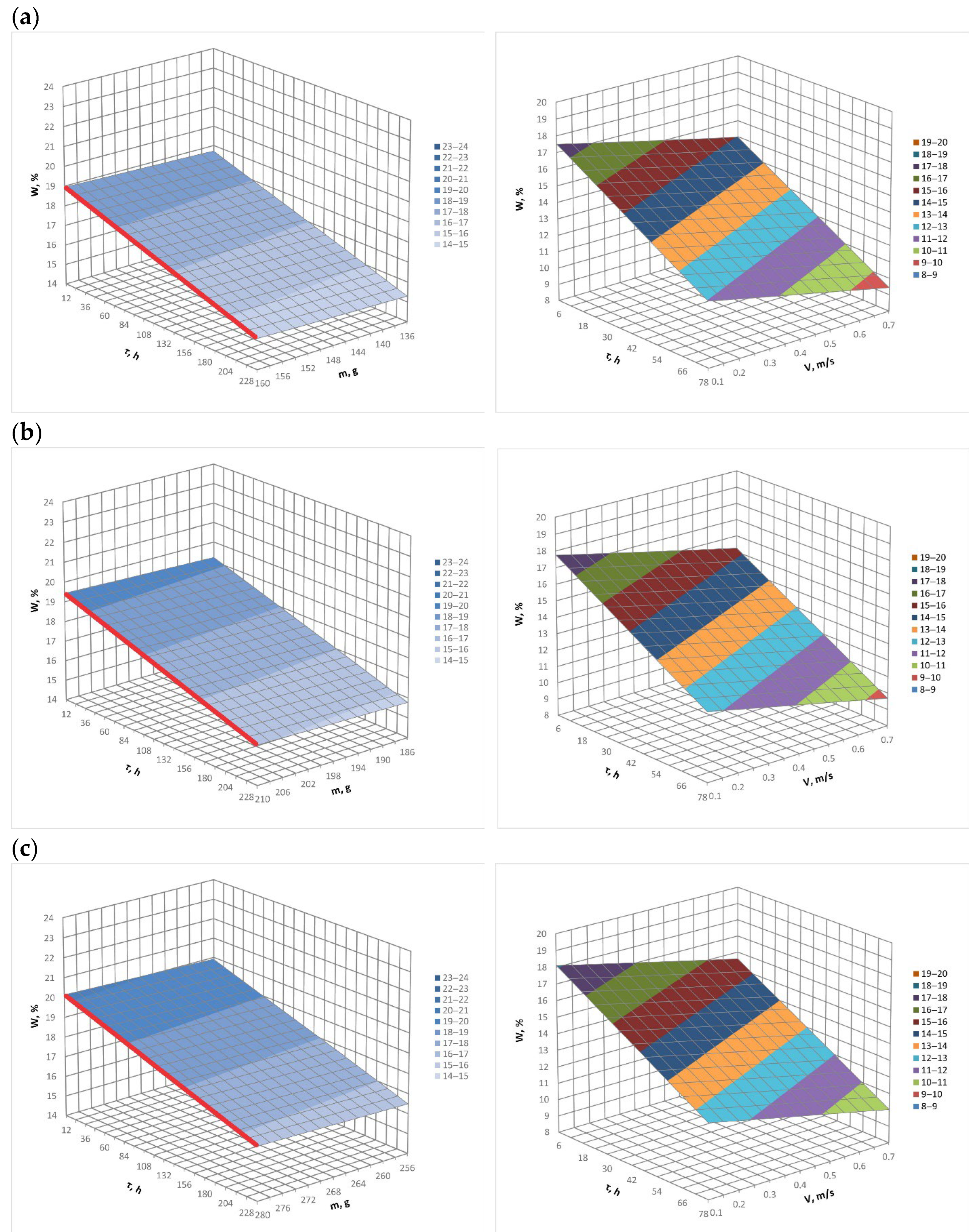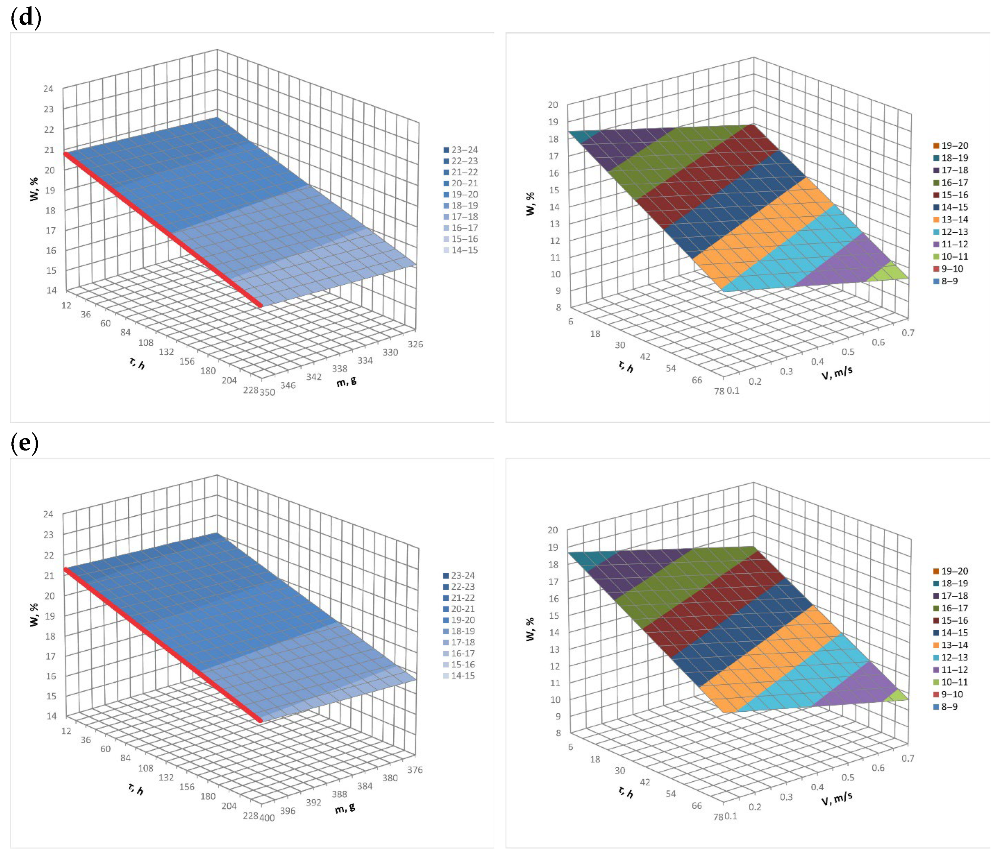 Figure 14. Modelled moisture content (W) of bee bread granules after drying with variation in controlled factors: flow velocity (v) of the drying agent (solar dryer only); drying time (τ); and mass (m) of bee bread on the shelf. Results are shown for masses of (a) 160 g, (b) 210 g, (c) 280 g, (d) 350 g, and (e) 400 g.