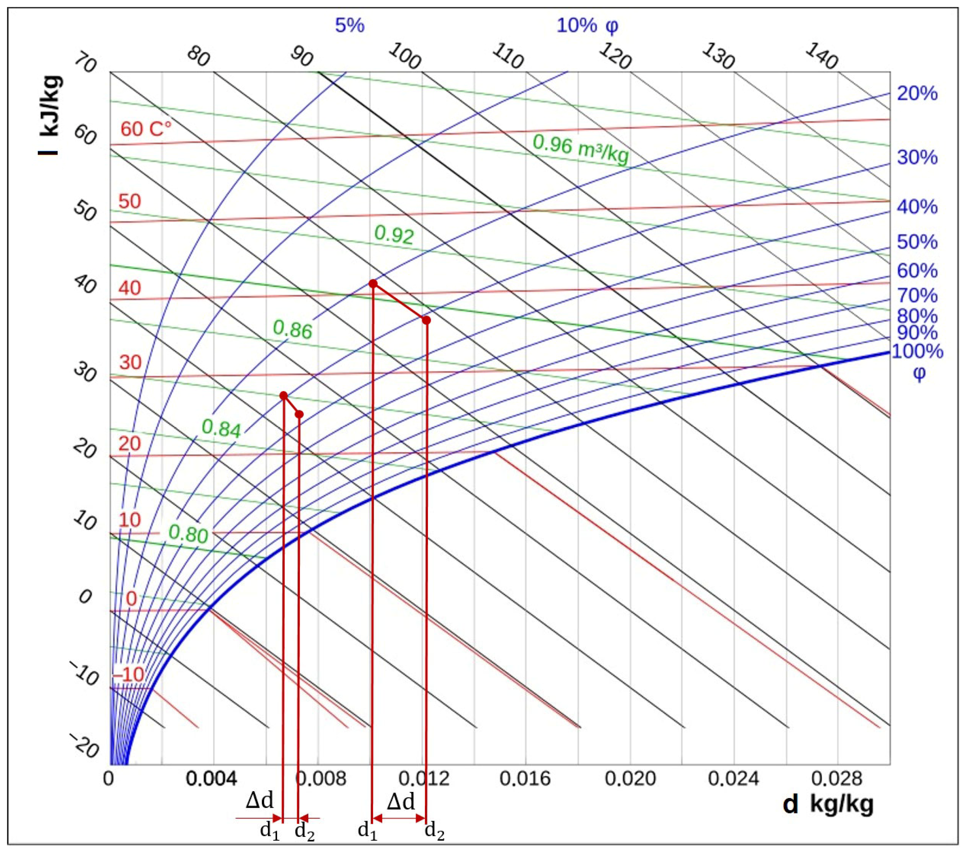 Figure 15. Relative moisture content of the drying agent (air) for: natural drying (left); solar drying (right).