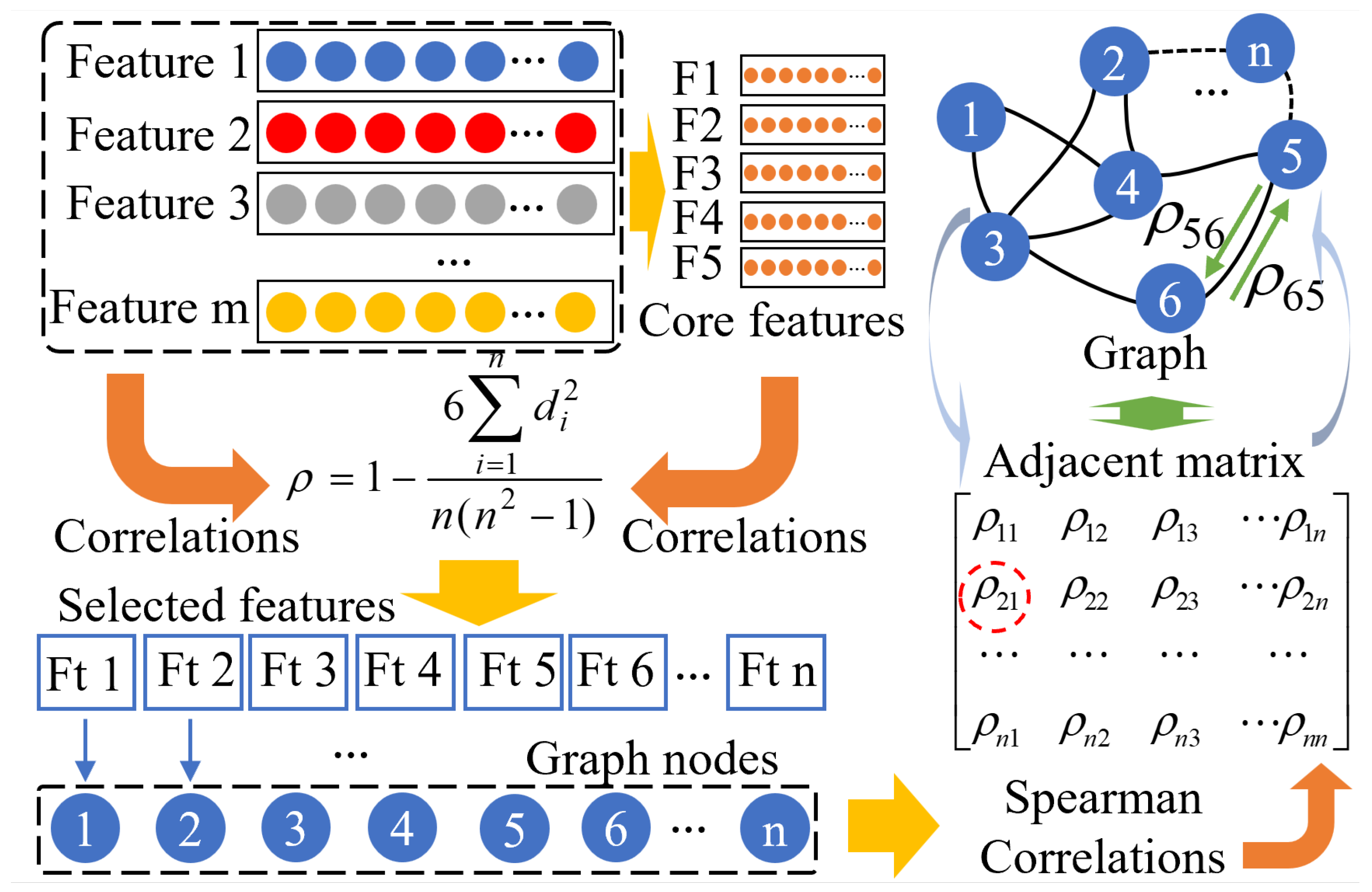 Spearman coefficients between features, an adjacency matrix is constructed, as shown in Equation (