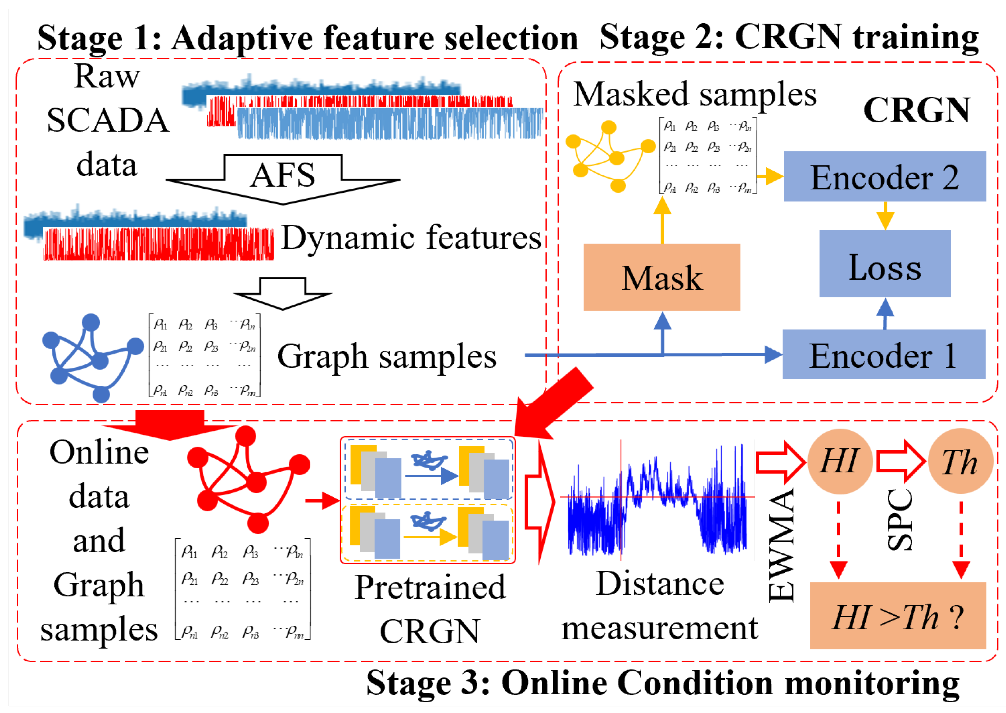 There are three stages in the proposed methodology: adaptive feature selection, CRGN training, and online condition monitoring. Stage 1 consists of data preprocessing and adaptive feature selection. It provides graph data samples for model training in Stage 2 and for condition monitoring in Stage 3. Stage 2 involves deep learning-based training of the CRGN model proposed in this study. It supplies pre-trained models for condition monitoring in Stage 3. Stage 3 is the process of online condition monitoring using samples from Stage 1 and the pre-trained models from Stage 2.