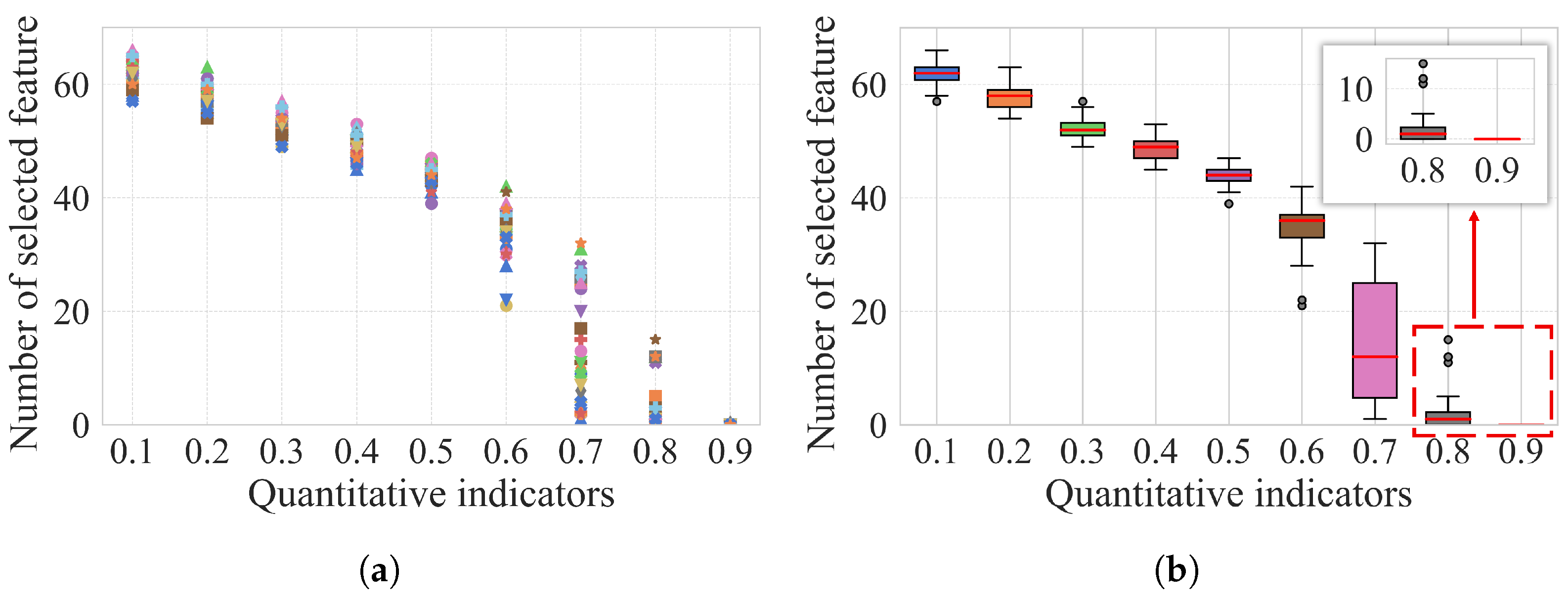 represents the correlation coefficients of remaining features with respect to the core features. Subsequently, a quantitative indicator is established. The variable indices with correlation coefficients exceeding this indicator correspond to those strongly correlated variables. These variables, combined with the core features, constitute the raw data samples used for model training. The quantitative indicator is a key parameter, and the number of adaptively selected variables varies, depending on its value. Typically, it ranges from 0.5 to 0.8. In this paper, it is set to 0.6 based on the experiments and discussions presented in