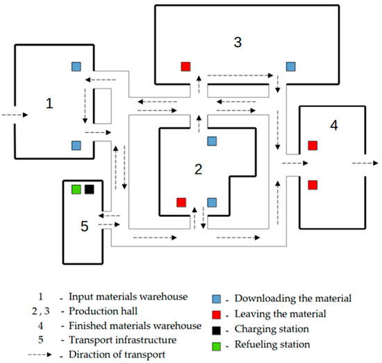 In this study, an analysis was carried out of the logistics process implemented in a manufacturing plant specializing in the production of steel products. The production process and the related internal logistics activities were carried out within four independent halls, comprising: the input materials warehouse (1), the finished goods warehouse (2), and two production halls ((3) and (4)). Additionally, other infrastructure elements were located within the plant premises, including transport infrastructure (5). The total length of the transport routes within the plant amounts to 492 m (Figure 1).