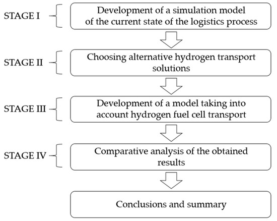 Achieving the stated objective, namely the evaluation of the effectiveness of implementing internal inter-operational transport based on hydrogen fuel cell (HFCV) forklifts, was made possible through the development of a four-stage research methodology (Figure 2).