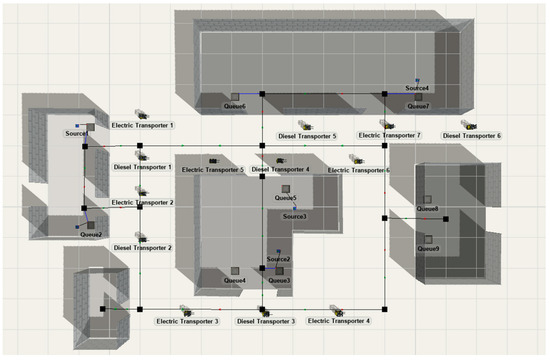 Conversely, the lowest utilization level was observed for Electric Transporter 6, operating on routes between Queue 7 and Queue 8 and Queue 9. For this vehicle, the actual operating time, including both product transport and return trips to pick up the next load, accounted for only about 25% of the total logistics process time. The low utilization rate was a consequence of short transport distances and limited demand for service in this area.
