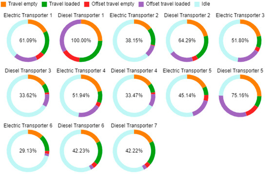 The utilization level of internal transport vehicles also showed variation, similar to the model including both electric and combustion forklifts (Figure 10).