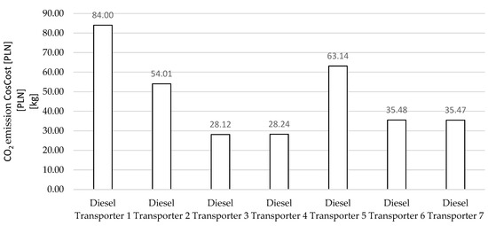 In the next stage of the study, the costs generated by all internal transport vehicles involved in the movement of goods within the analyzed case study were determined (Figure 9).