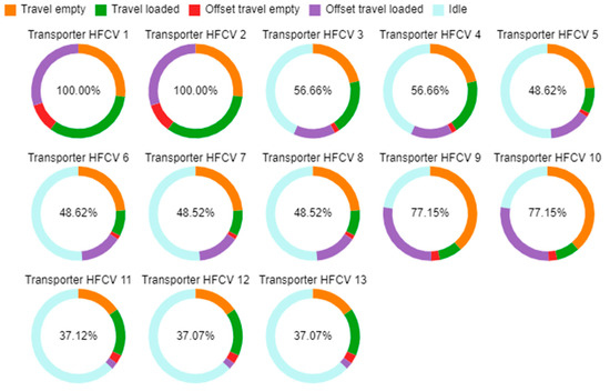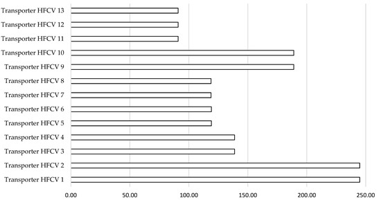 In the next stage of the study, a simulation was conducted for a logistics variant involving a fleet of thirteen hydrogen-powered HFCV forklifts. These vehicles performed an analogous process of transporting goods between the various locations of the logistics system, in accordance with the assumptions adopted in the base model (Table 6).