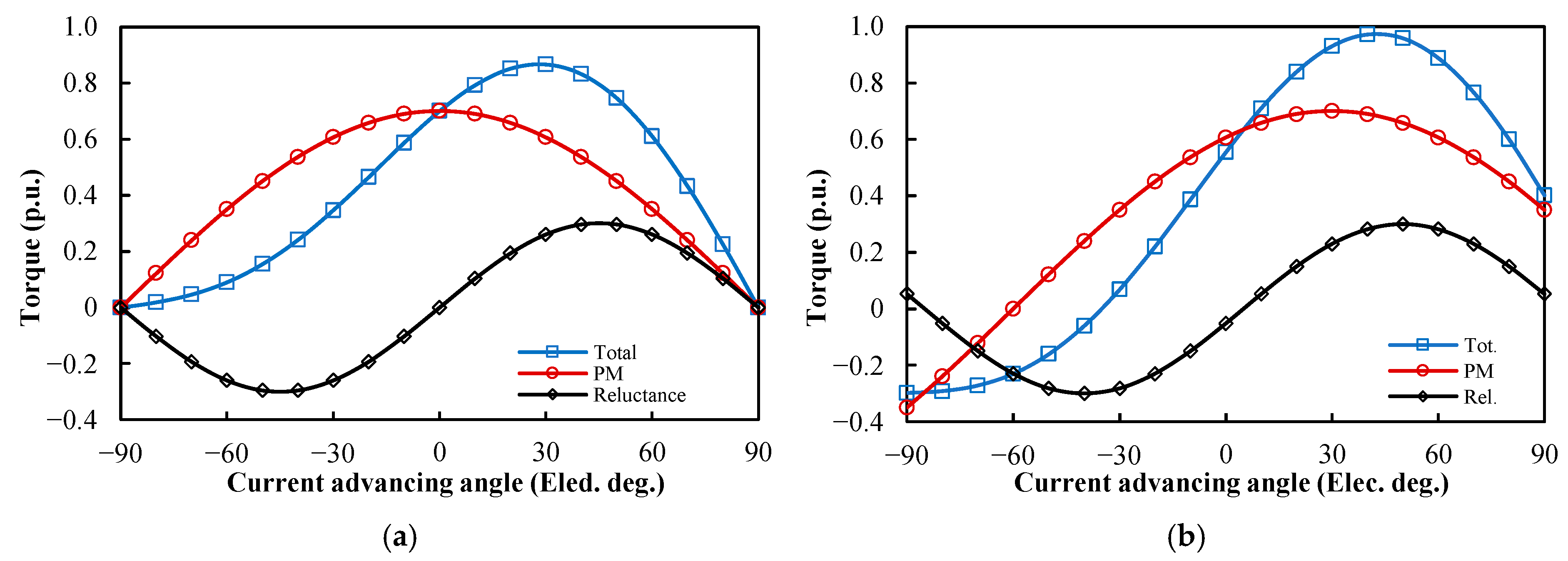 As mentioned before, in IPM and AIPM machines, the variations in the PM and reluctance torque components with current advancing angle are quite different. With the help of the frozen permeability method [