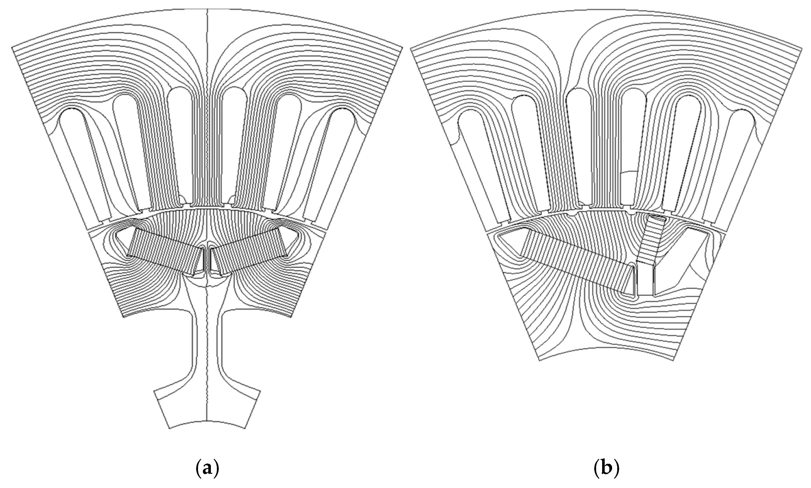 The flux line distributions of the DTP PMSMs with IPM and AIPM rotors under OC conditions are firstly calculated and compared, as shown in