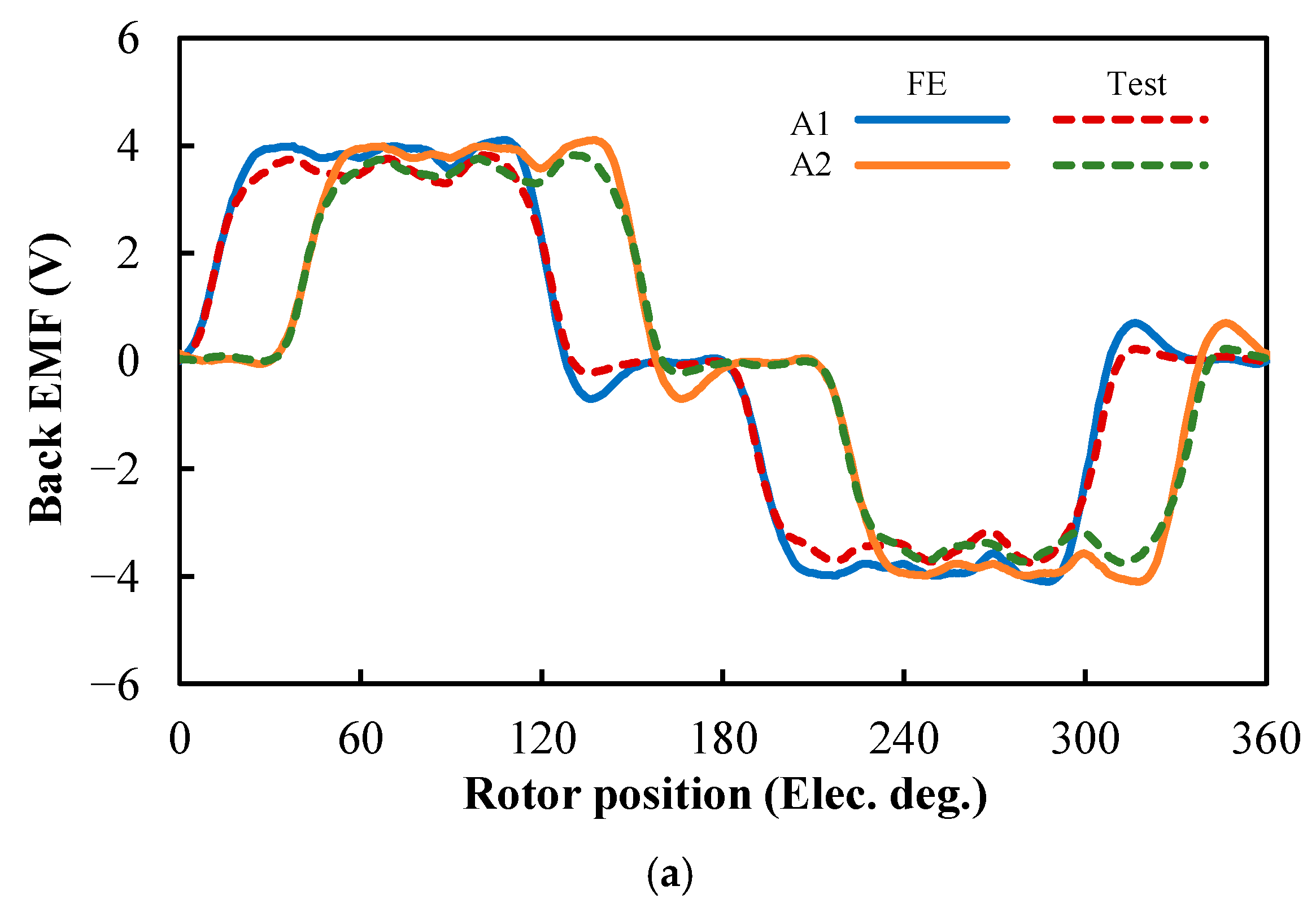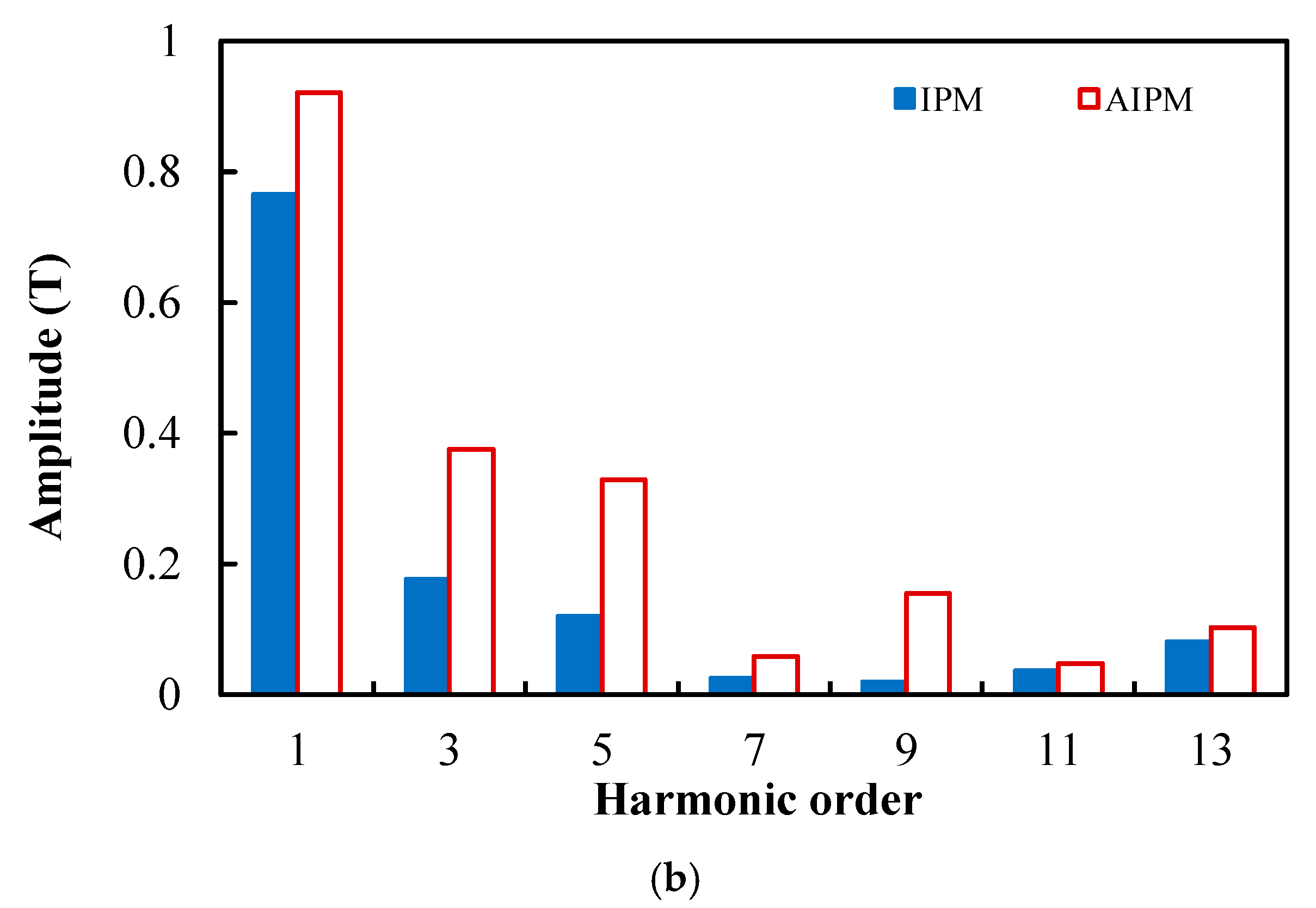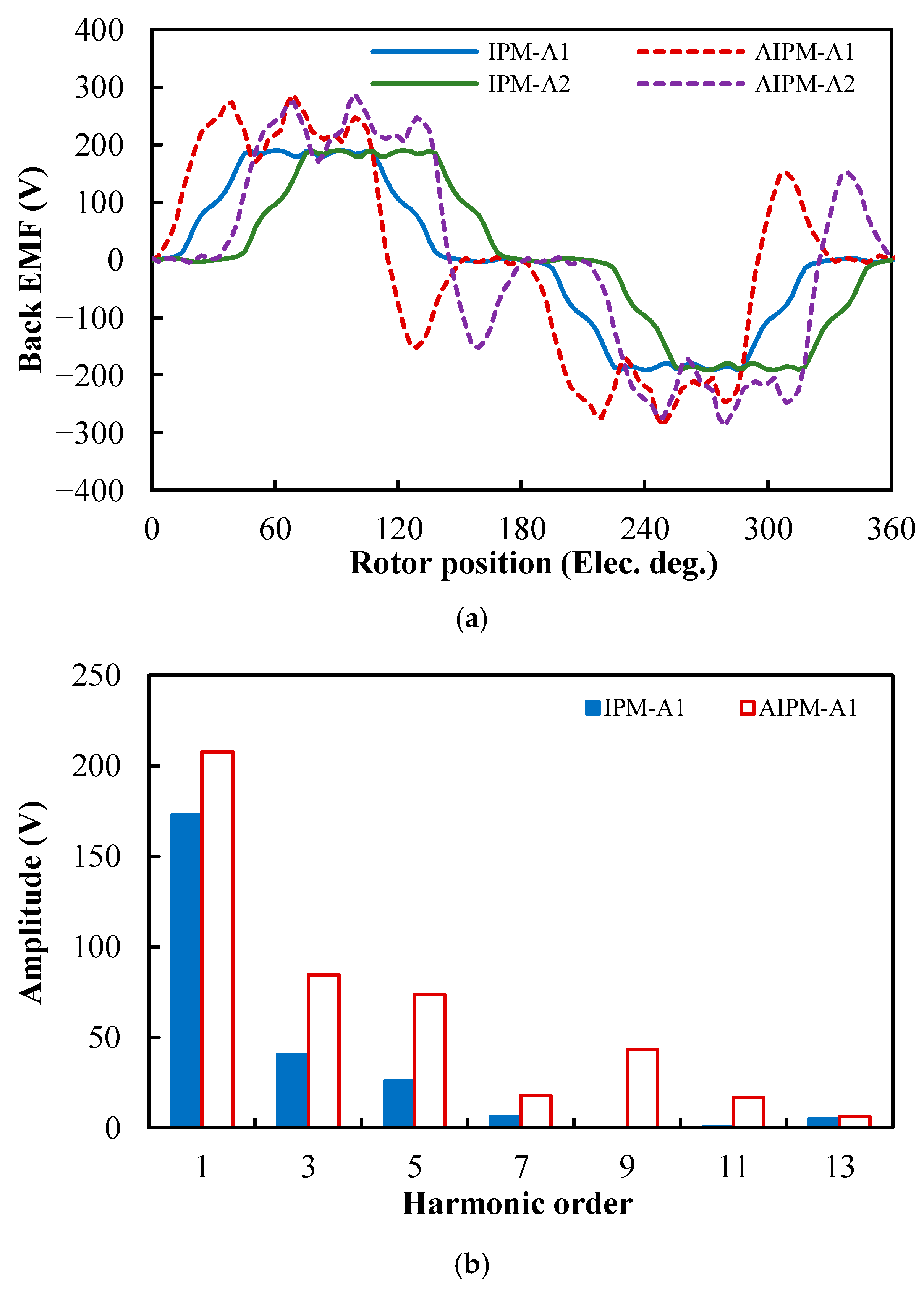 Figure 6b, it can be seen that similarly to the OC air-gap flux density, the amplitude of the fundamental back EMF in the AIPM machine is higher than that in the IPM machine.