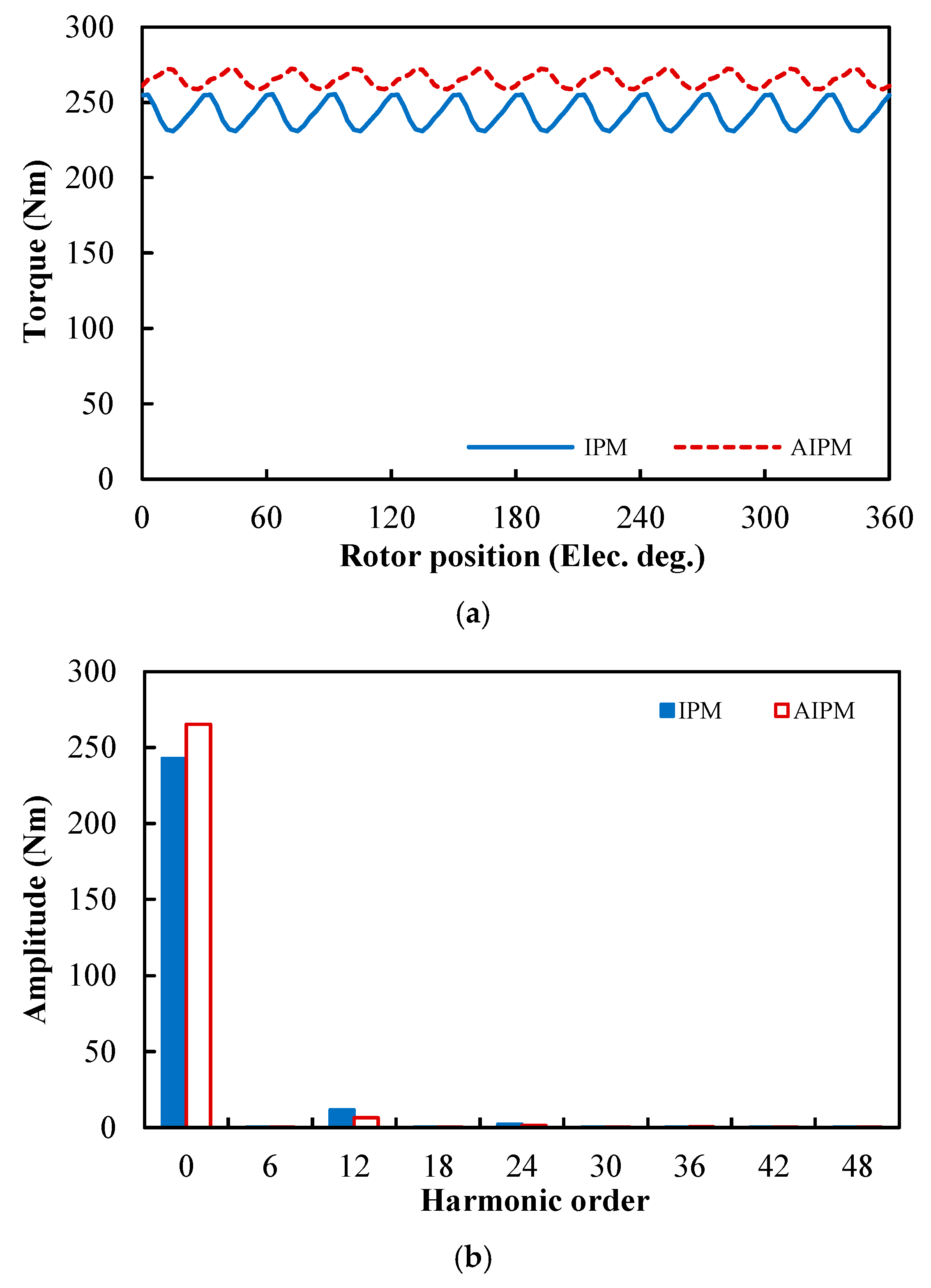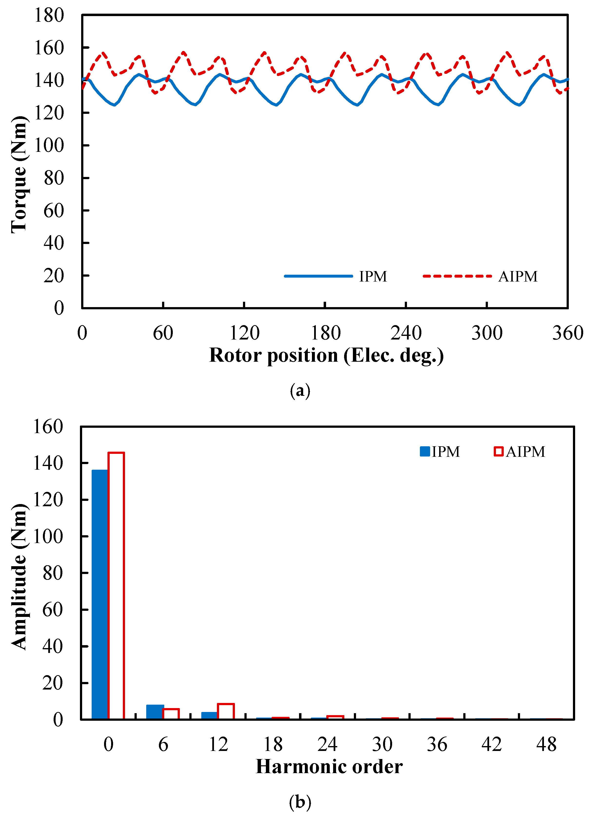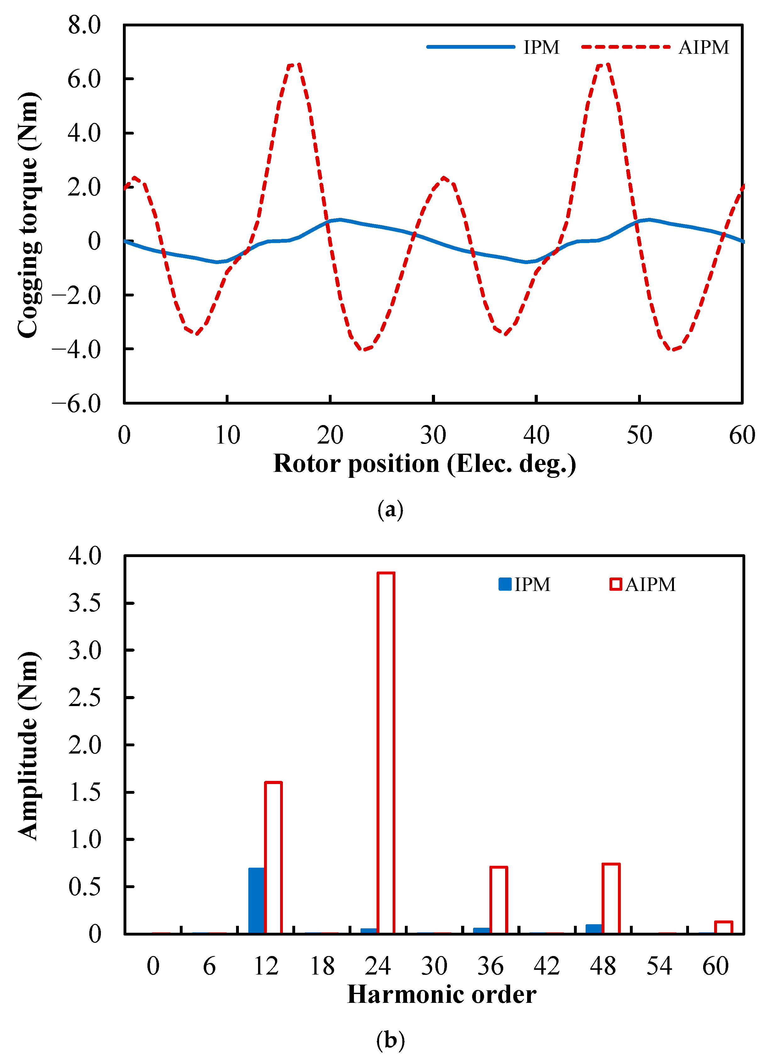 Figure 7a,b. Due to the same slot/pole number combination, the fundamental orders of cogging torque in the IPM and AIPM machines are exactly the same, which is 48 in mechanical angle (the smallest common multiple between slot number, 48, and pole number, 8) and 12 in electric angle, but the amplitudes of the same harmonic order are different in the IPM and AIPM machines. In the analyzed DTP PMSMs, the cogging torque produced by the AIPM rotor is much larger than that produced by the IPM rotor.