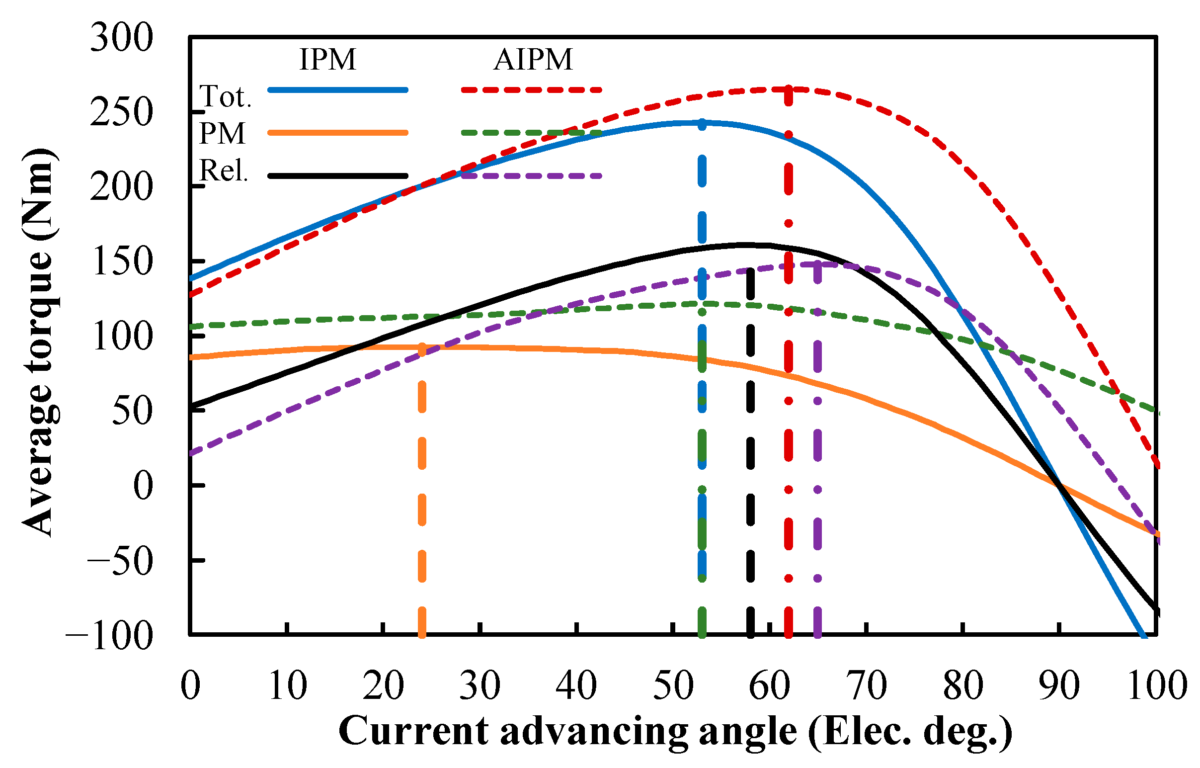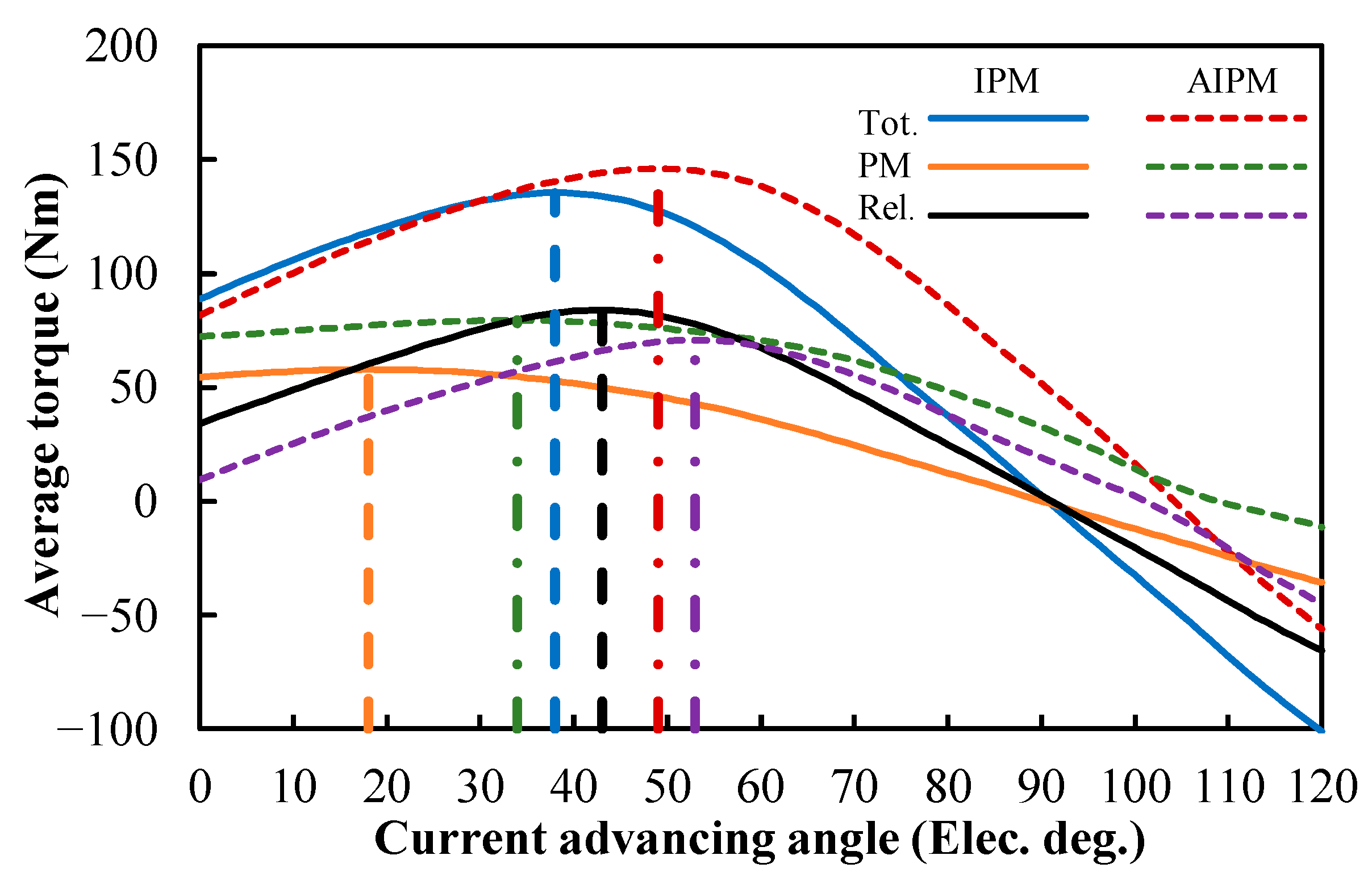 Figure 8. It can be found that the optimal current advancing angles for the maximum PM torque component are 24° in the IPM machine, and 53° in the AIPM machine. To achieve the maximum reluctance torque component, the optimal current advancing angles are 58° and 65°, respectively, in IPM and AIPM machines. The current advancing angles to achieve the maximum total, PM, and reluctance torques in the IPM machine were marked with dash lines in the figure. Similarly, the current advancing angles to obtain the maximum total, PM, and reluctance torques in the AIPM machine were marked with dot-dash lines in Figure 20. The optimal current advancing angles for different torque components are summarized in