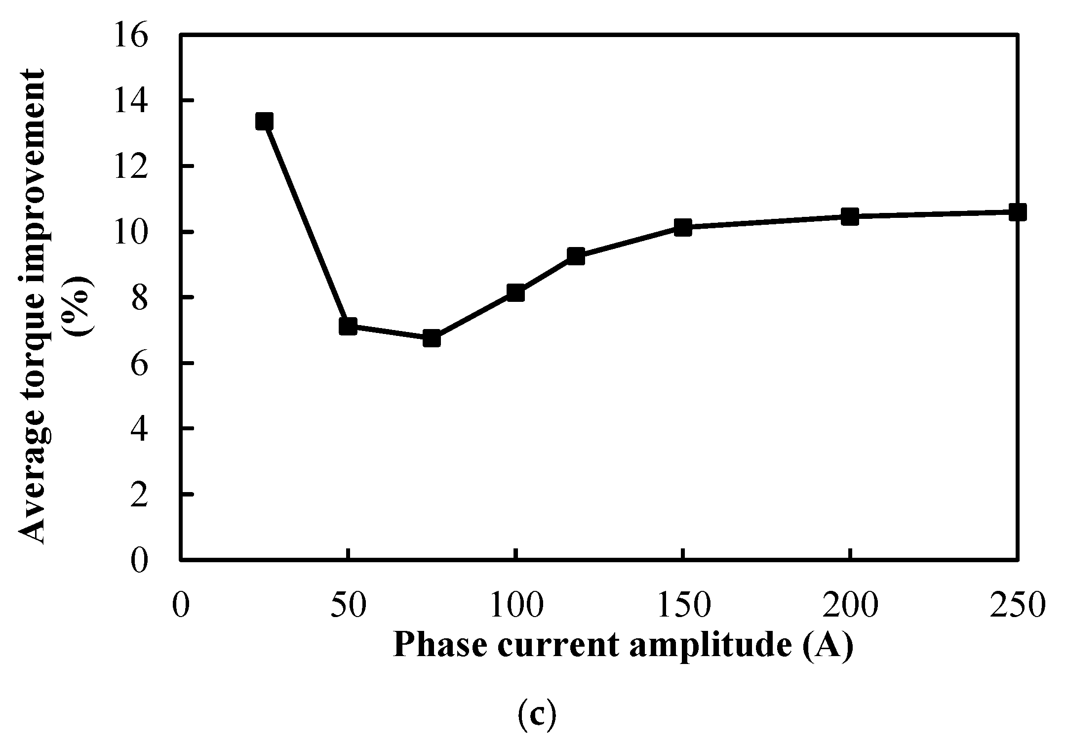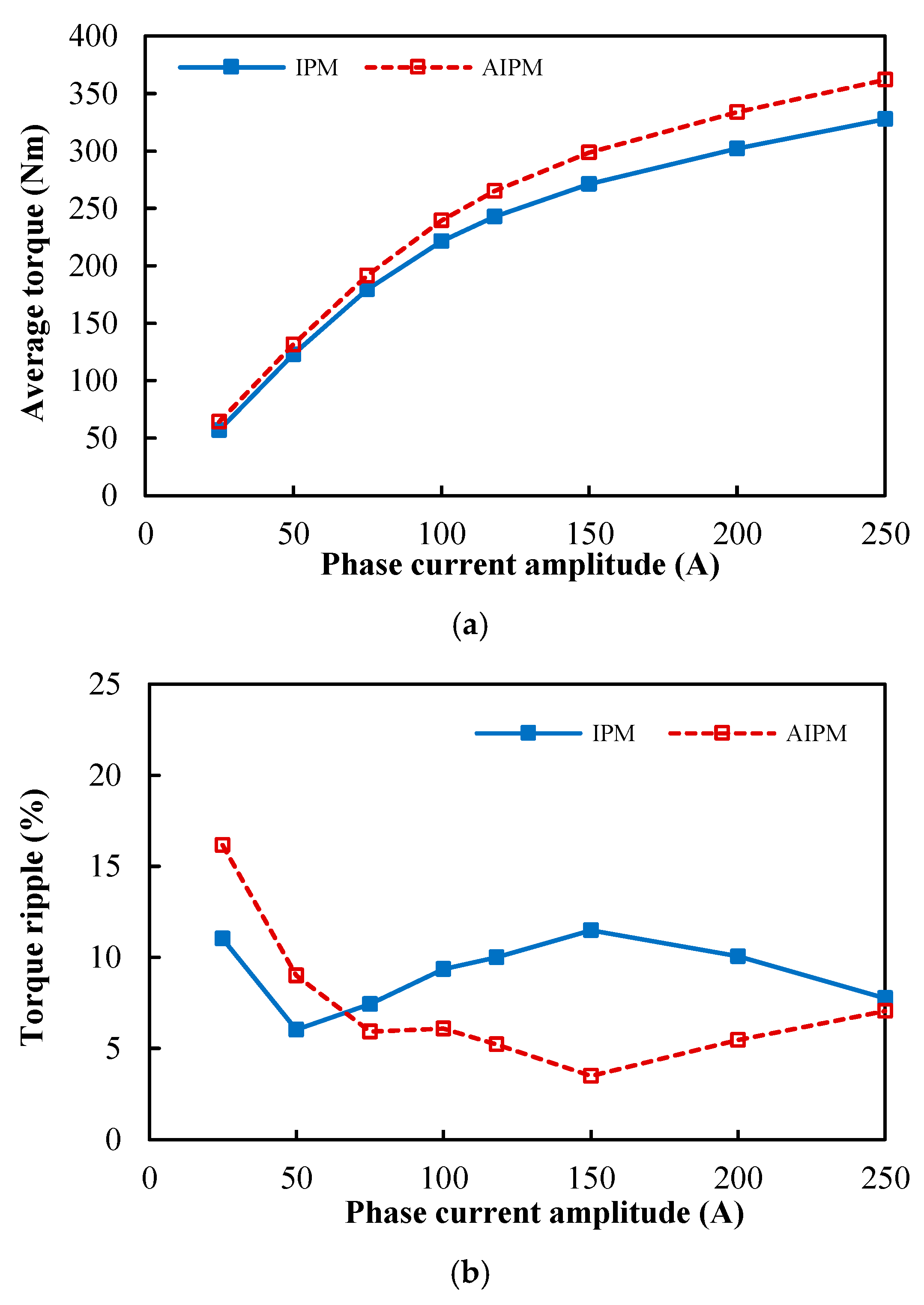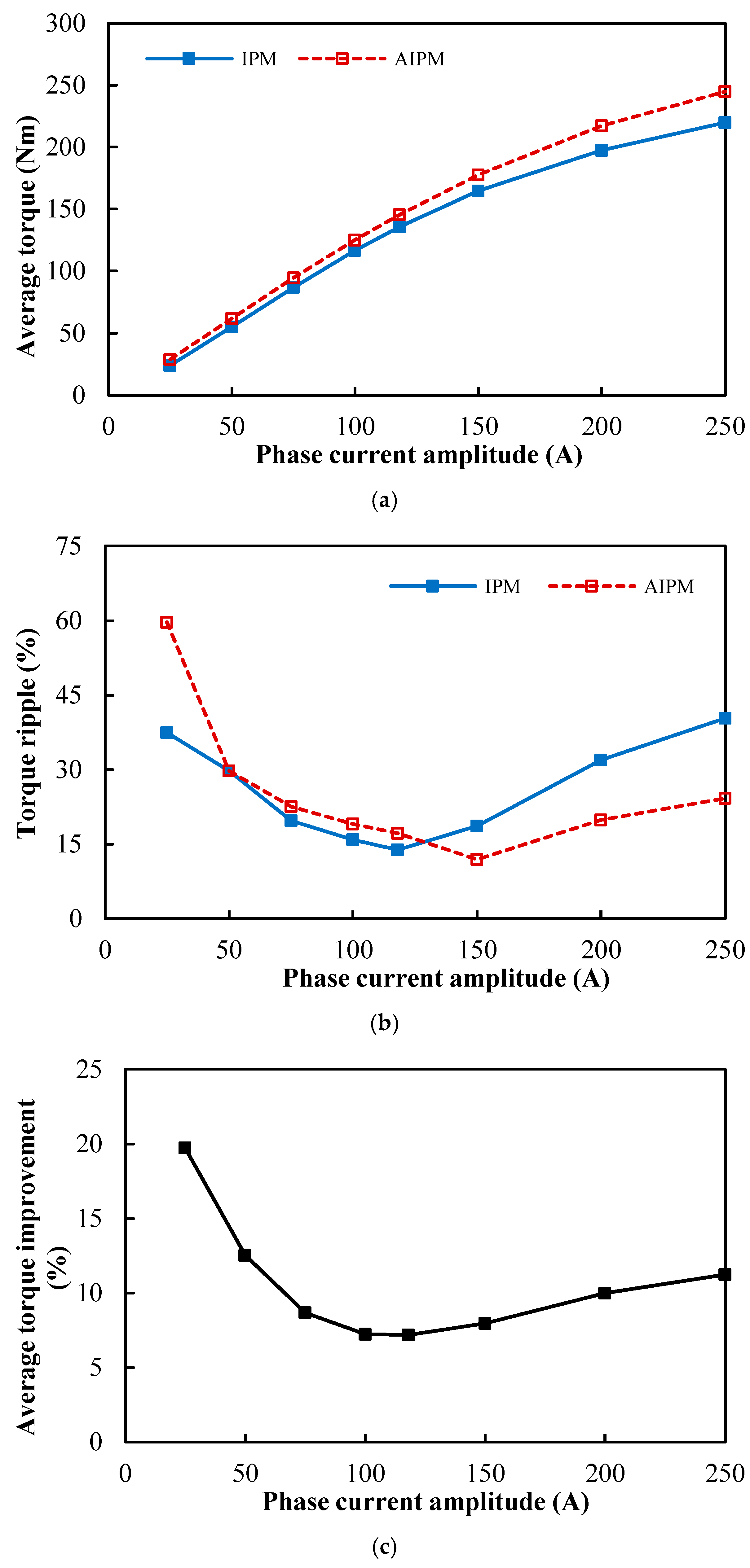 Figure 10c. In addition, when the phase current ≥ 75 Apk, not only can the average torque be improved, but the torque ripple can also be reduced using the AIPM rotor. Hence, the AIPM rotor can greatly improve the torque performance of the DTP PMSM.