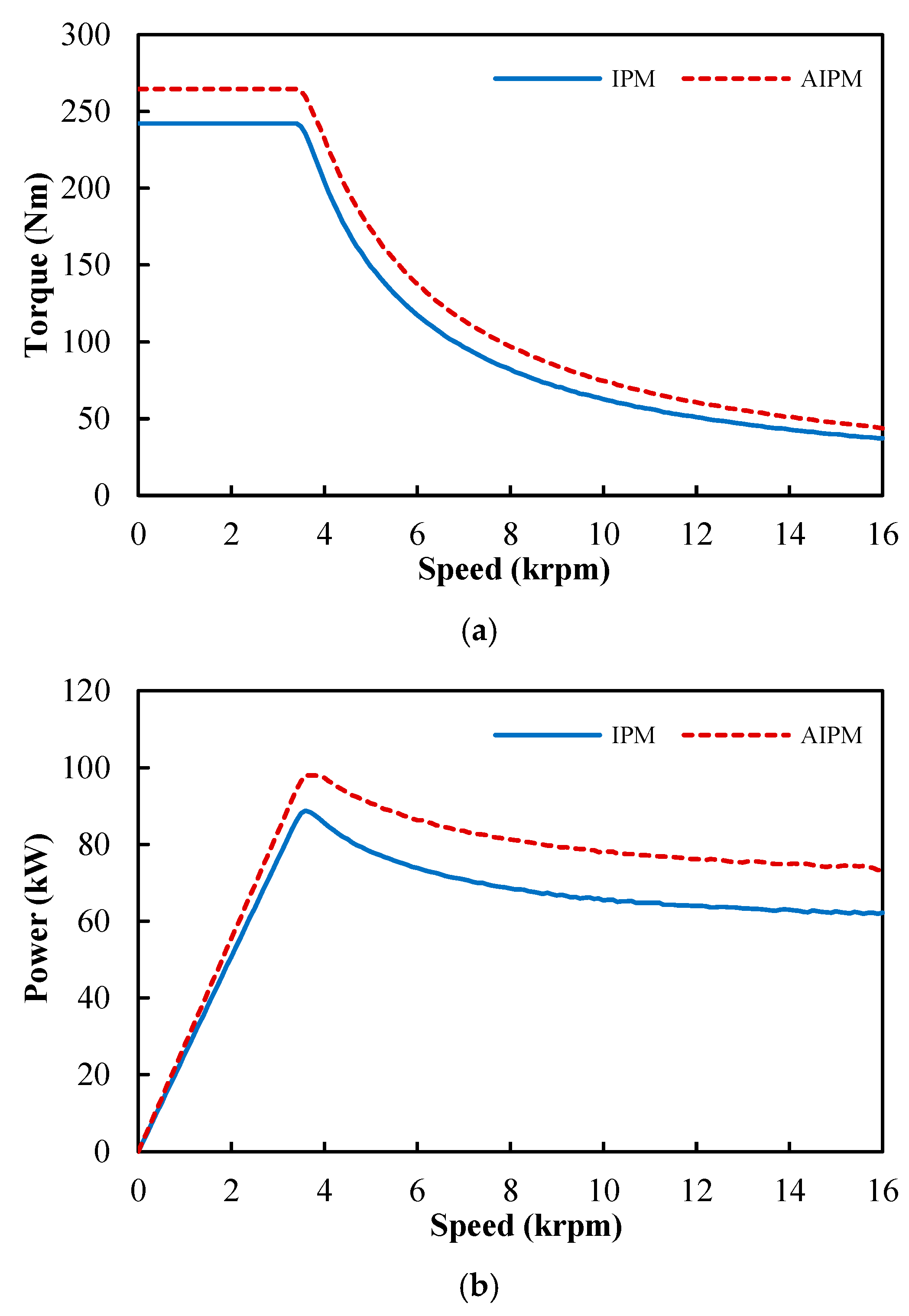 Figure 12. It can be clearly seen that the AIPM machine can produce higher torque than the IPM counterpart, not only in constant torque region (low speed), but also in constant power region (high speed).
