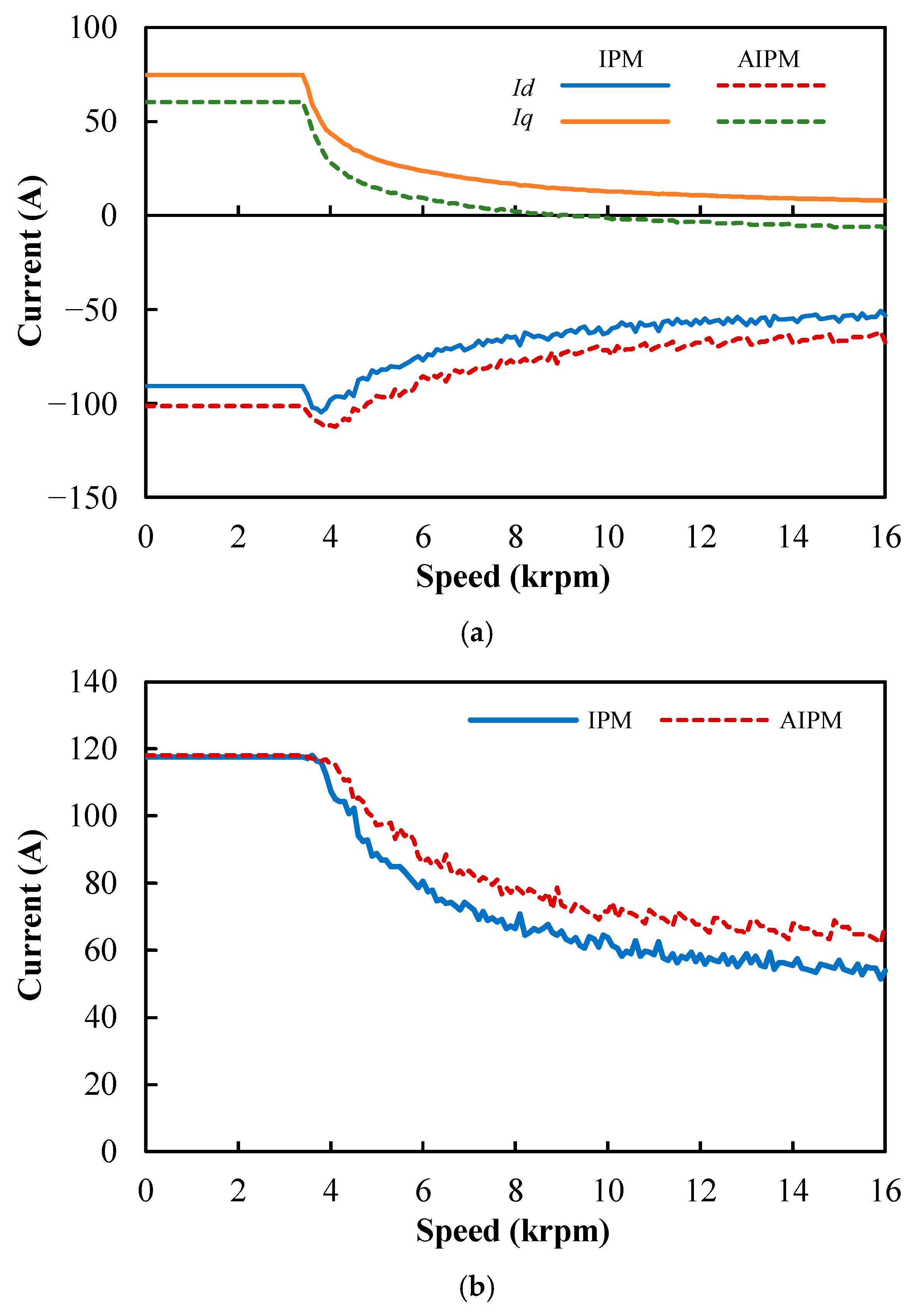Figure 14, it can be observed that the iron loss in the AIPM machine is higher than that in the IPM counterpart at high speed, and at low speed and low torque. However, as shown in