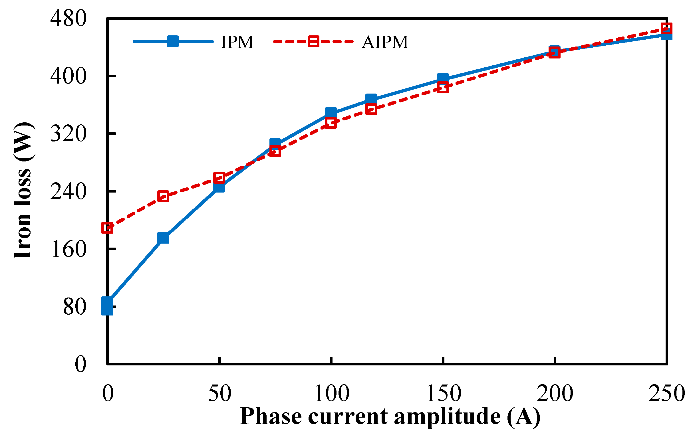 Assuming the phase currents vary from 0 to 250 Apk, the iron losses of the DTP PMSMs with the IPM and AIPM rotors at 3000 rpm are compared in