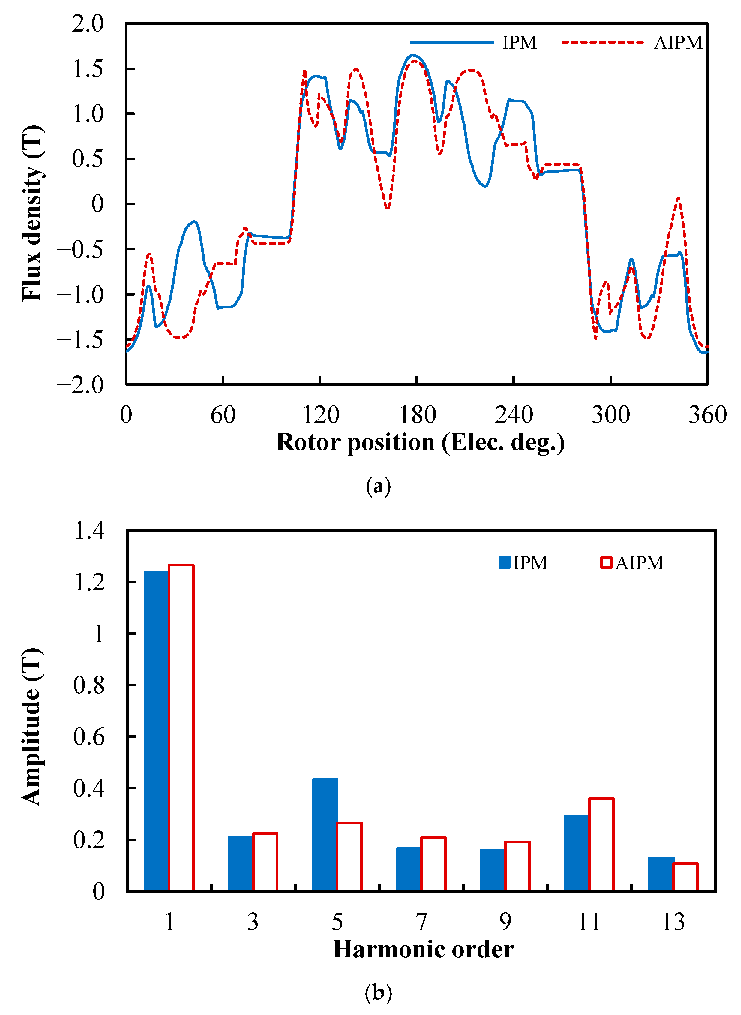 Figure 5b, it can be clearly seen that the AIPM rotor has a higher fundamental component, which can be attributed to the flux-focusing effect caused by the flux barrier in the AIPM rotor. However, the AIPM machine also shows more harmonic contents compared with its IPM counterpart, which may result in larger eddy current loss in the AIPM machine. Hence, the flux density distributions of the benchmark PMSMs under OC conditions suggest that the loss and efficiency of the DTP PMSMs with IPM and AIPM rotors need more attention in the following analyses.