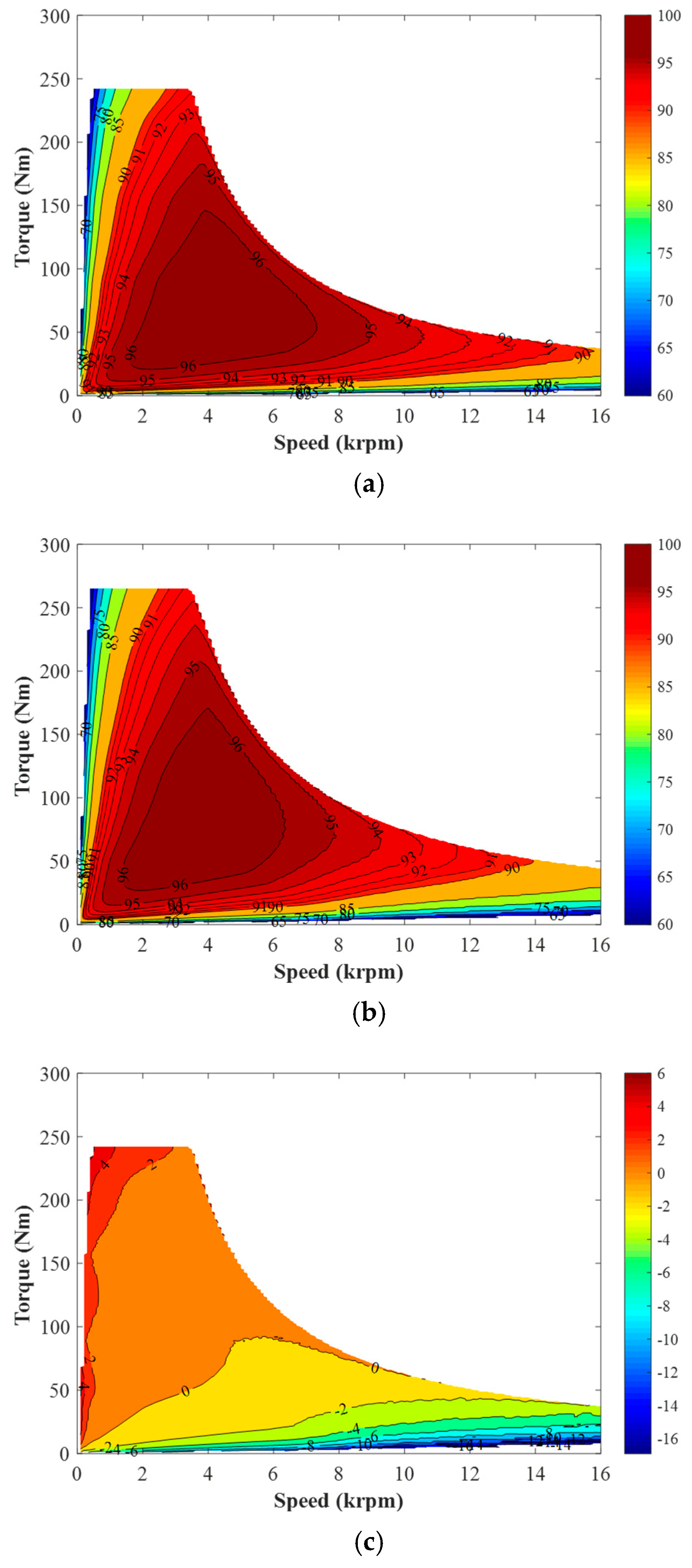 Figure 16, the efficiency maps of the DTP PMSMs with IPM and AIPM rotors are calculated, as shown in