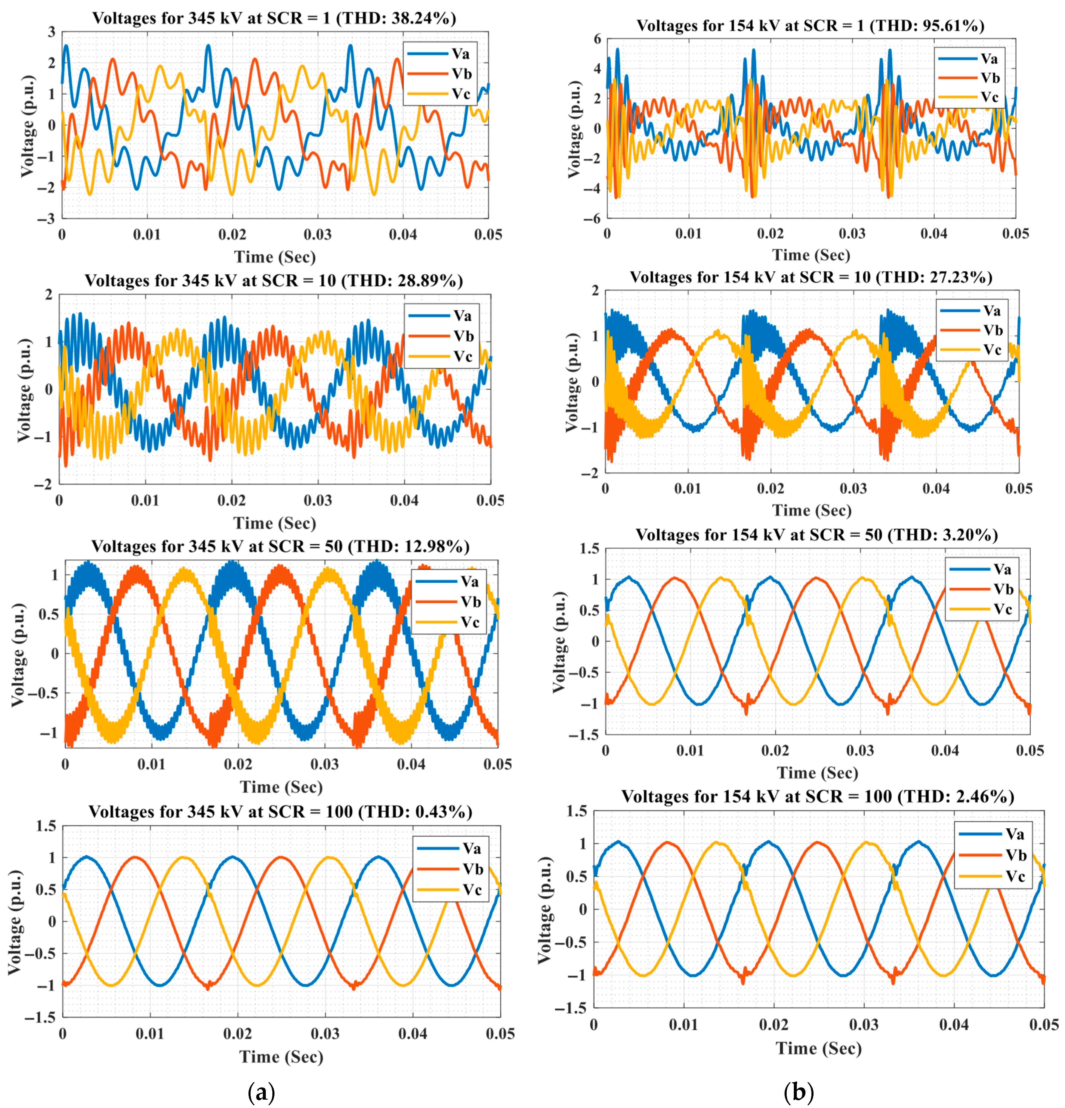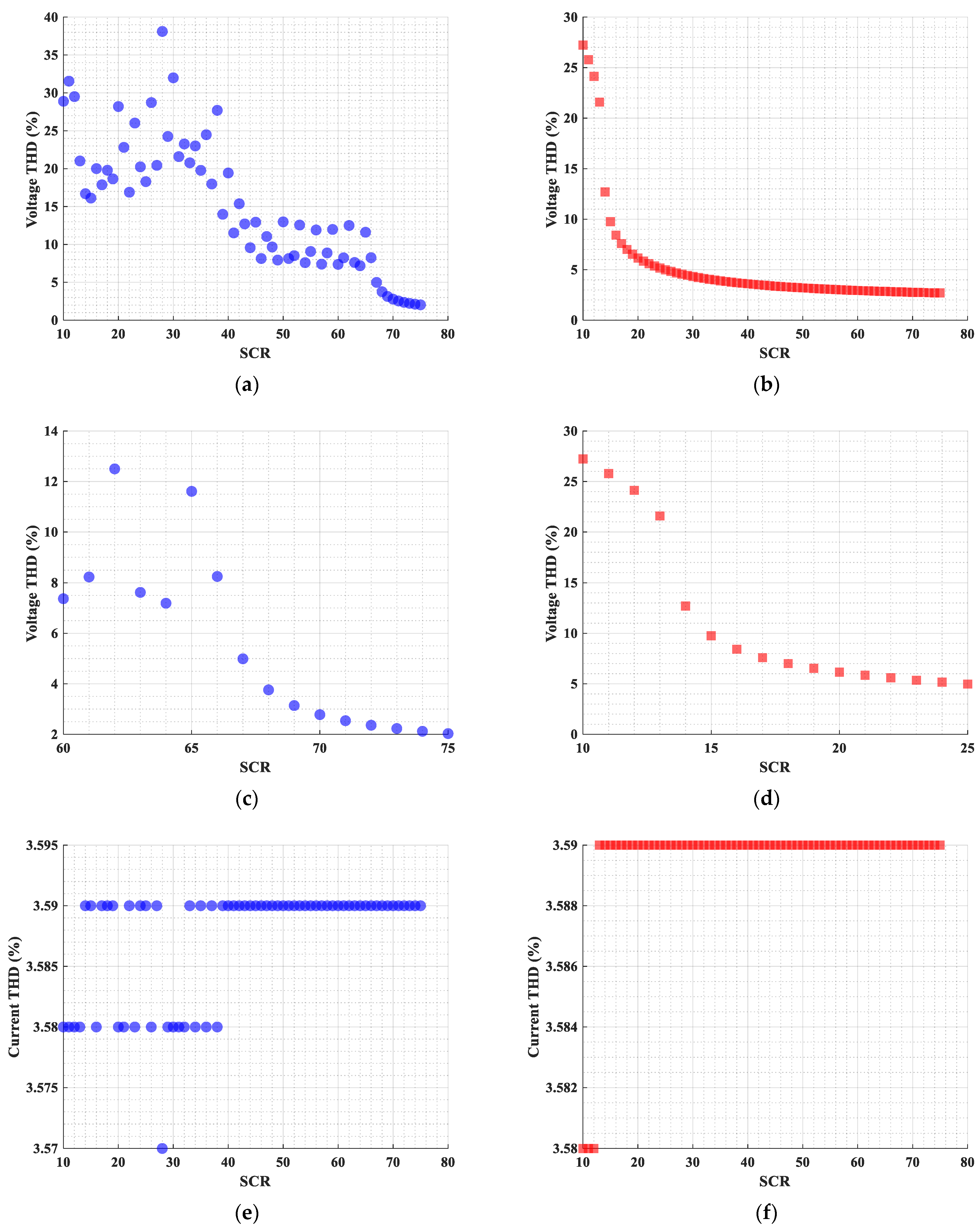 - This study investigates the relationship between SCR and THD in offshore wind farms at 154 kV and 345 kV through detailed simulations. In the 345 kV system, THD shows non-monotonic variations due to shifting resonance bands. Approximate SCR ranges that minimize resonance effects are identified: above ~14 for 154 kV and above ~71 for 345 kV, providing practical guidance for wind farm design.