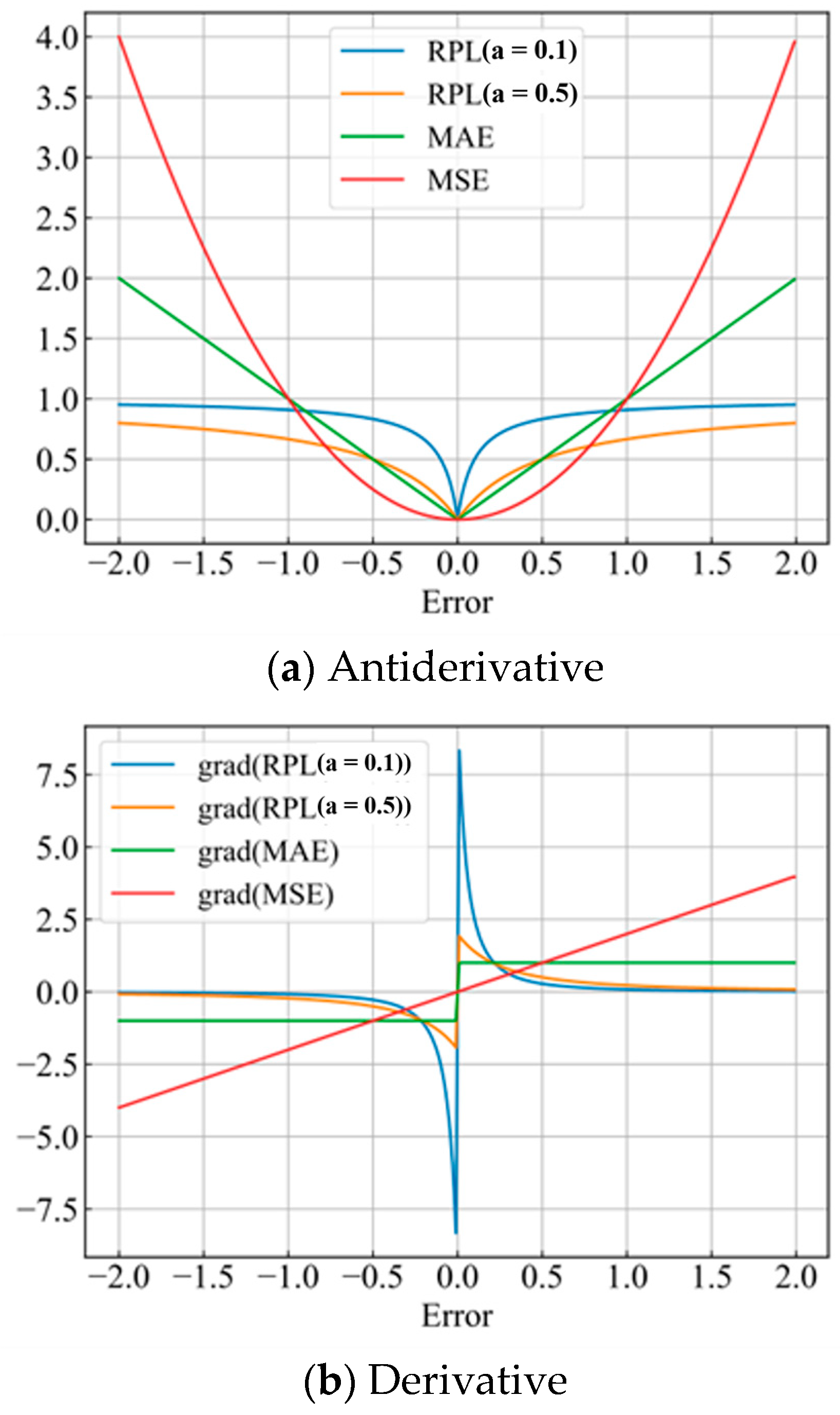 Figure 1, it can be found that the gradient of RPL increases and then decreases with the error: the gradient is sensitive to the error within a certain range, and when the error is too high (anomaly), the gradient is less sensitive to the error, which suppresses the effect of the outliers on the optimization of the model. Unlike the MSE and MAE, it greatly reduces the sensitivity of the model to outliers, enhances the generalization performance of the model, and is less prone to overfitting.