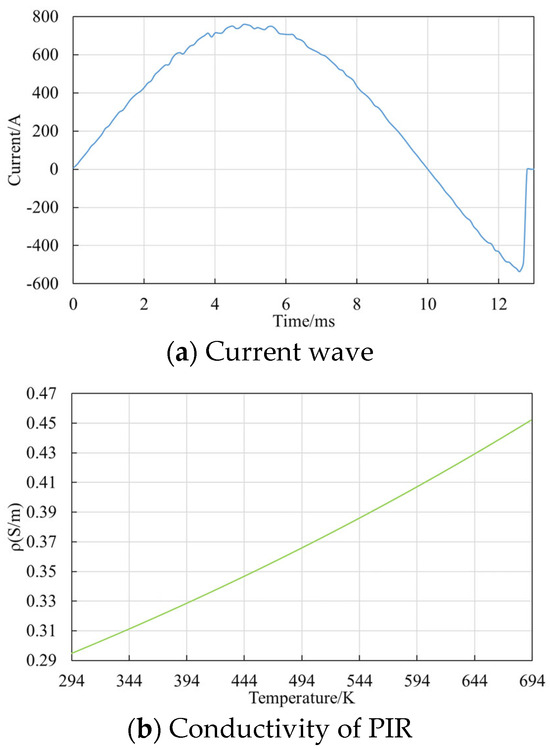 The underlying principle of the simulation is that when a substantial current flows through the PIR, significant heat is generated. The PIR, which becomes warmer than its surrounding environment, will exchange heat with nearby objects and the ambient surroundings through mechanisms such as conduction, convection, and thermal radiation. The entire simulation involves three main physical fields: electric, thermal, and flow fields. The interrelationship between these three physical fields is shown in Figure 7. The whole simulation process is divided into two steps: In the first step, the PIRs are energized with an approximate sinusoidal current with a starting phase of 0. In the second step, PIRs are cooled for 30 min. The thermal capacity of the 550 kV circuit breaker PIR was specified as follows: twice at two times the rated phase voltage, with a time interval of 30 min between the two times. Therefore, the cool simulation time was set to 30 min. In the simulation, there were four factors affecting the temperature of the PIR: current value, current duration, starting ambient temperature, and the initial temperature of the PIR itself. The physical parameters of the PIR, insulating rod [43,44], and SF6 are shown in Table 2 and Figure 8.