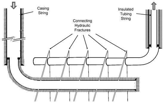This study focuses on the shale gas field in the Haynesville area, northwestern Louisiana in the United States selected according to the heat flow map presented by Blackwell et al. [6]. The heat flow in the gas field is very similar to that in North Dacota [7,8,9]. The studied well structure (fractured well pair) is a modified version of U-shaped well proposed by Liao et al. [10]. The heat energy productivity of the U-shaped well was thoroughly studied by other investigators including Ma et al. [11], Riahi et al. [12], Schulz [13], and Sun et al. [14]. The temperature and thermal power data presented in Figure 3, Figure 4, Figure 5, Figure 6, Figure 7, Figure 8 and Figure 9 show that the newly proposed fractured well pairs are more beneficial than the U-shaped wells. This is attributed to the higher efficiency of heat transfer in fractures than in wellbores.