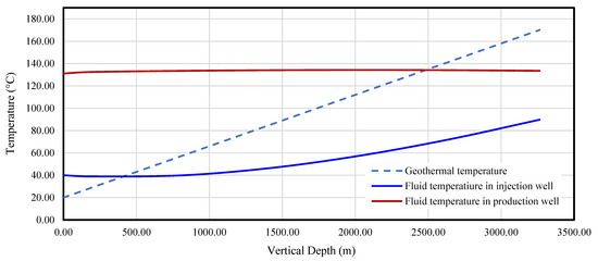 Figure 3 shows the model-predicted temperature profile at the end of Year 3 of operation. It is indicated that the injected fluid loses heat to the formation soil at a shallow depth and gains heat at deeper depths due to the geothermal temperature gradient. The injected fluid gains significant heat as it flows through the fracture toward the fluid production wellbore. The temperature of the fluid at the exit of the fracture is 128.8 °C, which is much lower than the geothermal temperature of 170 °C at the deeper depth, meaning that the fluid still has high potential to gain more heat if parameters are optimized. In the production wellbore, the temperature of the fluid first gains heat and then loses heat due to the geothermal gradient. Overall, the fluid temperature declines by 5 °C in the production wellbore and reaches 126.76 °C at the surface. This temperature is adequate for generating electricity with ROC technology [1].