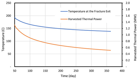 Figure 4 presents the model-predicted transient profiles of temperature and thermal power at the exit of the fracture (bottom of the fluid production wellbore) in the first year of operation. It shows that the temperature, and thus thermal power, of the produced fluid declines quickly in the first 6 months and slowly after 6 months. At the end of the first year, the temperature of the fluid at the exit of the fracture is about 150 °C. This number is slightly higher than the temperature of the fluid at the exit of the fracture of 133 °C at the end of Year 3, indicating a minimal decline in temperature at the fracture exit over the three-year period.