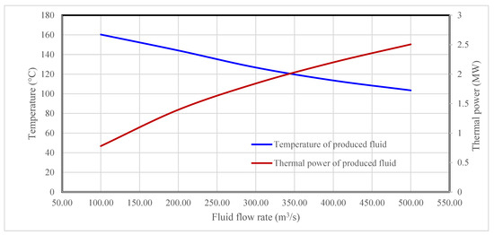 Effect of fluid volumetric flow rate on the temperature and thermal power of the produced fluid.