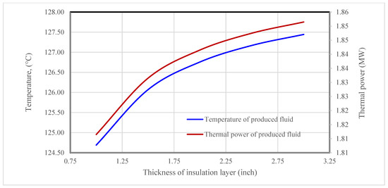 Effect of insulation layer thickness on the temperature and thermal power of the produced fluid.