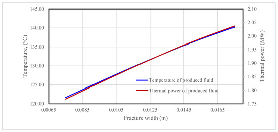 Figure 8 presents two curves to show the effect of fracture width on the temperature and thermal power of the produced fluid. It shows that the temperature of the produced fluid increases with the fracture width. This is expected, because for a given fluid flowrate, the fracture width determines the area of the formation that is available to the fluid. Thus, increasing the fracture width increases the area of the fracture network that the fluid interacts with, resulting in greater heat transfer from fractures to the fluid.
