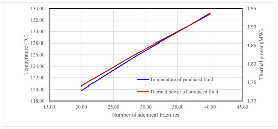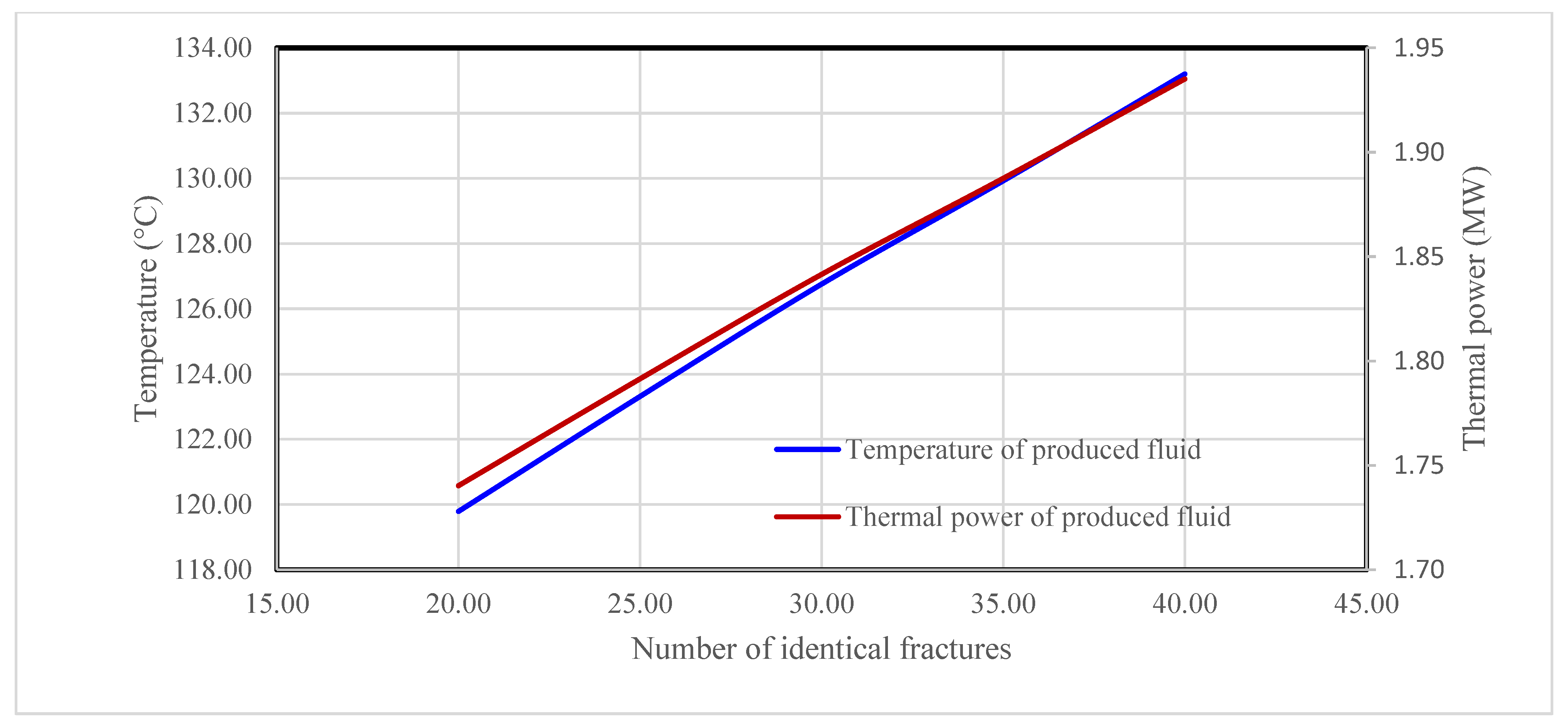 - At a given fluid flowrate, increasing the number of identical fractures will increase the area of the fractures and fluid retention time in the fractures. Higher heat transfer efficiency from the formation rock to the work fluid is expected, and a higher temperature and thermal power of the produced fluid are anticipated.